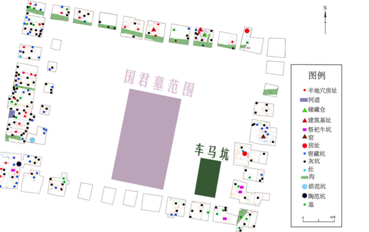 随着历代卫侯墓由村内不断向外拓展,早期的规划已无法满足卫侯埋葬用地需求,进入西周晚期至春秋早期,该区域已变更为卫侯墓地,居民点遭到废弃。春秋早期,辛村遗址遭到一次大规模破坏,但遗址仍有人迹,已出现了人工水渠。