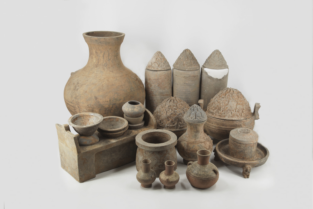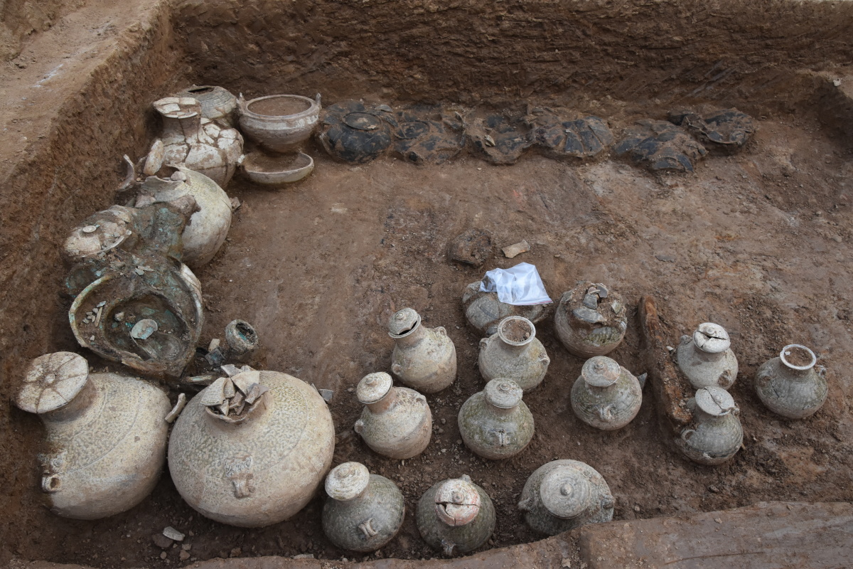 本次发掘共出土随葬器物300余件,主要有铜器、陶器、原始瓷器等。其中陶器组合以鼎、壶、盒(土坑墓)和仓、灶、井(砖室墓)为主;原始瓷器出土40余件,器型有鼎、大壶、小壶、钫壶等;铜器主要有有铜盆、铜镜、铜熏炉、印章、弩机及铜车饰件等。