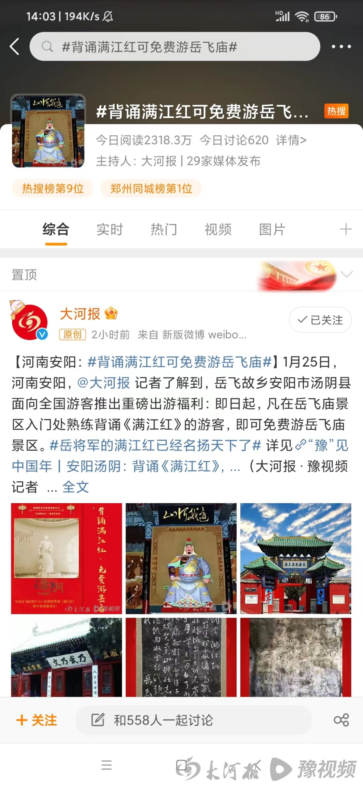 其中,岳飞庙景区抓住电影《满江红》热映契机,推出“背诵《满江红》,免费游岳庙”活动。该资讯在大河报•豫视频APP、大河报官方微博等大河报全媒体平台发布后,1月27日#背诵满江红可免费游岳飞庙#话题火上全国热搜。
