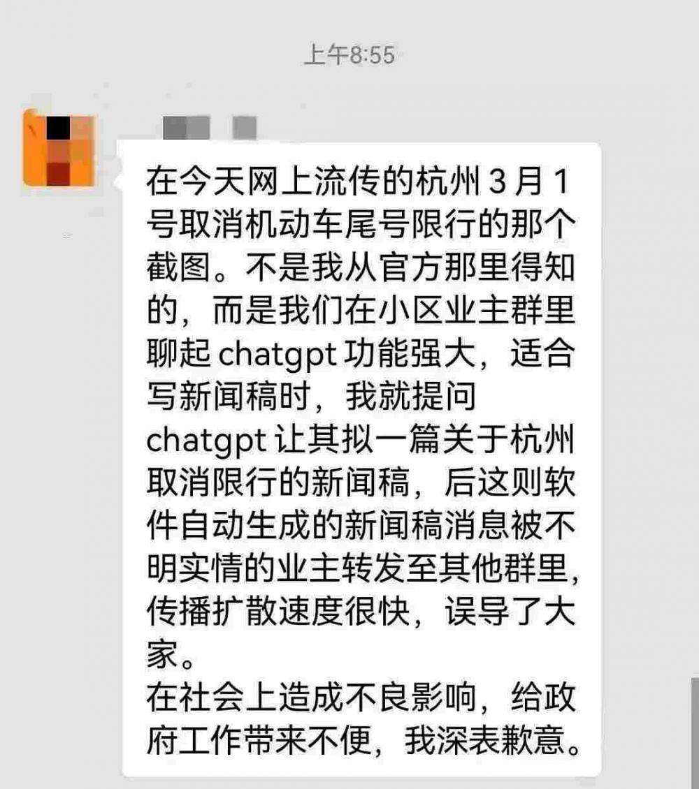 据媒体报道,16日下午,杭州某小区业主群讨论ChatGPT,一位业主开玩笑说尝试用它写篇杭州取消限行的新闻稿,随后在群里直播了使用ChatGPT的写作过程,还把文章发在群里。这篇“假新闻”行文严谨、语气措辞得当,也基本符合官方通报的格式,其他业主不明就里,随后截图转发,导致错误信息大规模传播。