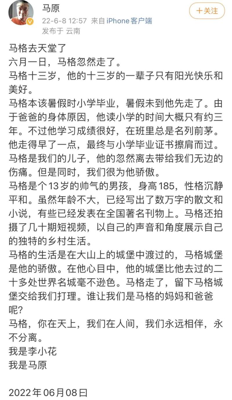 2022年6月8日,先锋派作家马原在微博发文称,自己13岁的小儿子马格在儿童节这天猝然离世。这让通过纪录片《文学的日常》认识了这一家人的网友只觉突然和震惊。在马原的这条微博之下,留言大多都在感慨命运的不公——马原身患癌症,又在60多岁的年纪经历丧子之痛——大家都劝他节哀,要保重自己的身体。