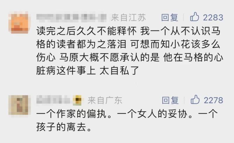 在这篇文章后,读者们留言表示,“去年无意中在马原的微博里看到他发布的‘马格离去’的消息,我惊诧万分。那么一个活生生的13岁的生命怎么就走了呢?今天在这篇文章里得到了答案。”“是浪漫的文人,也是愚昧的老人。”