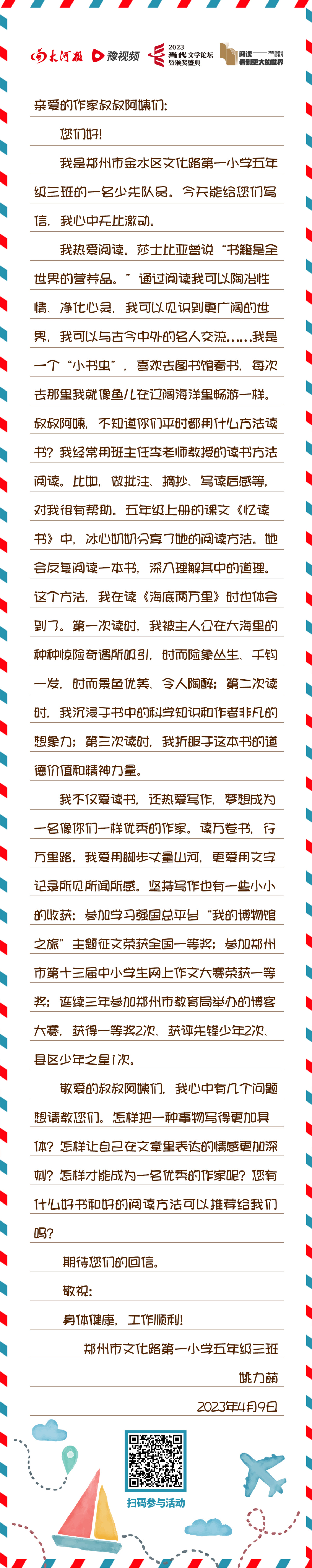 我向作家写封信 | 郑州市文化路第一小学五年级三班姚力萌