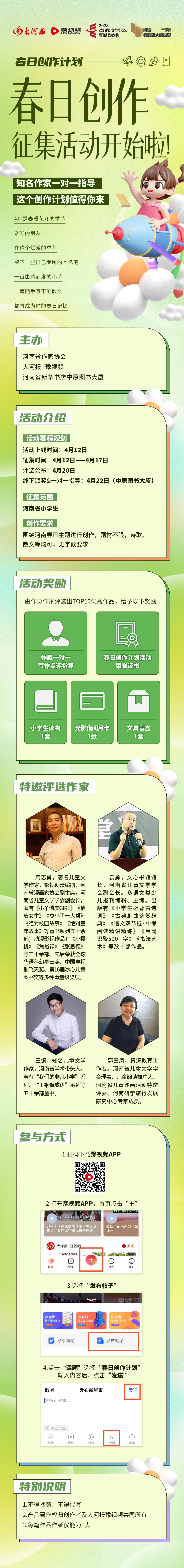 春日创作征集活动开始啦!在这个烂漫的季节,写下专属自己的文字,为这个春天留下美好的回忆。还有机会获得知名作家一对一专业指导及其他精美奖品,点击海报,了解活动详情。
