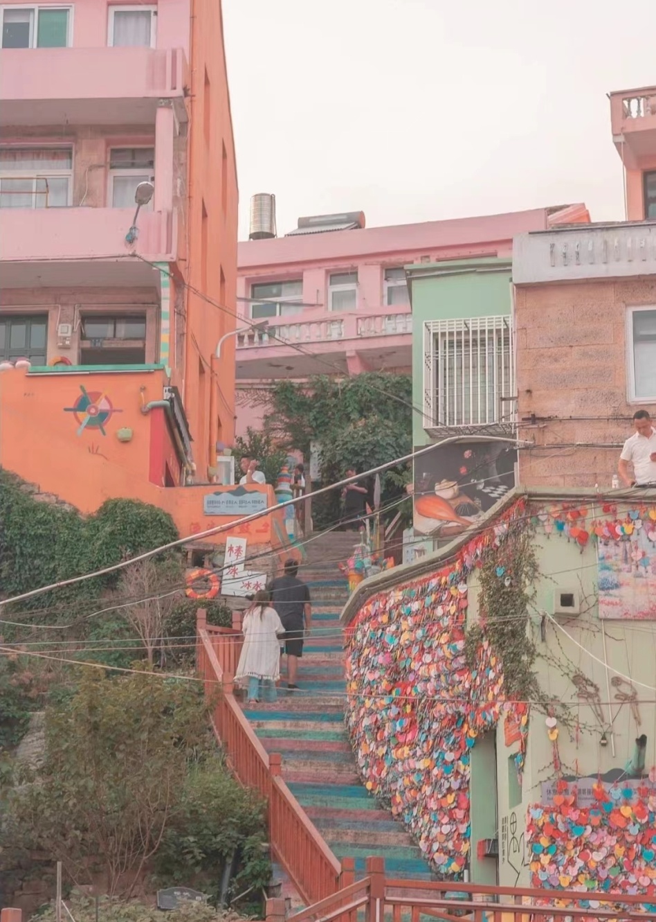 这里三面环海,村间小道曲折往返,房屋墙壁被刷上马卡龙般的色彩,粉色、紫色、黄色……像一个精心调制的大号颜料盘,色彩斑斓复杂却不凌乱,如同存在于滤镜里,在小箬渔村看海,是不是别有一番浪漫呢?