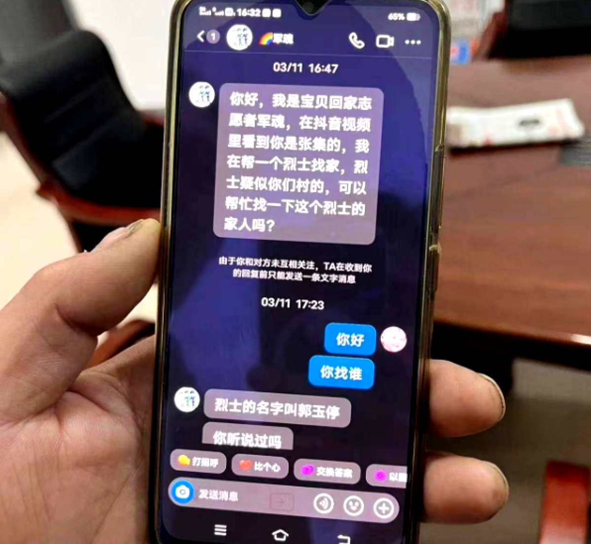 说到寻亲成功,还是要得益于一个短视频。郭国亮告诉记者:今年初,自己的弟弟郭国耀通过互联网平台,发布了一个带有村庄定位的短视频,3月11日,一个自称是宝贝回家志愿者的人通过平台私信找到了郭国耀,起初,他们全家觉得这是一场骗局。