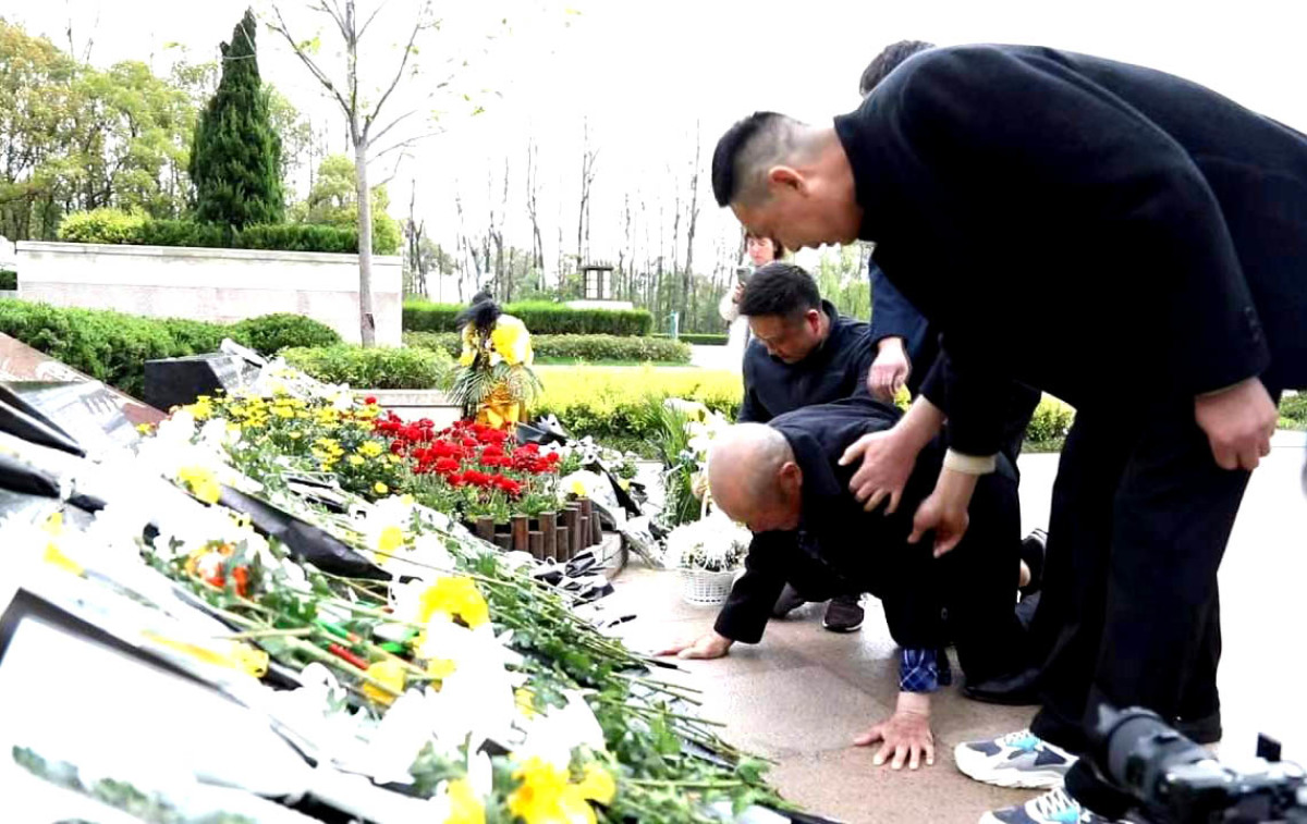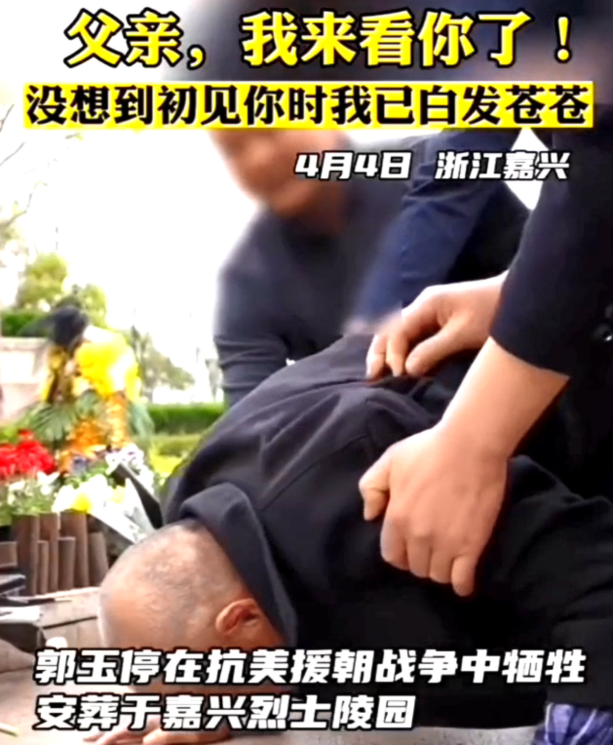 郭国亮告诉记者,在4月4日早上7点,父亲和自己的家人后代,终于踏上了“认亲”之路。他们从河南舞阳到浙江嘉兴,10个小时的车程、850公里的奔赴,对于患有类风湿性关节炎、股骨头坏死等疾病的父亲郭志安来说,并非易事。 “爸爸......”下午近5时,他们一行人到达嘉兴烈士陵园,见到写有爷爷名字的墓碑,这位已是爷爷的老人瞬间“破防”,扑通一声跪在墓前,哭得像个孩子:“走了75年,我终于找到您了!”