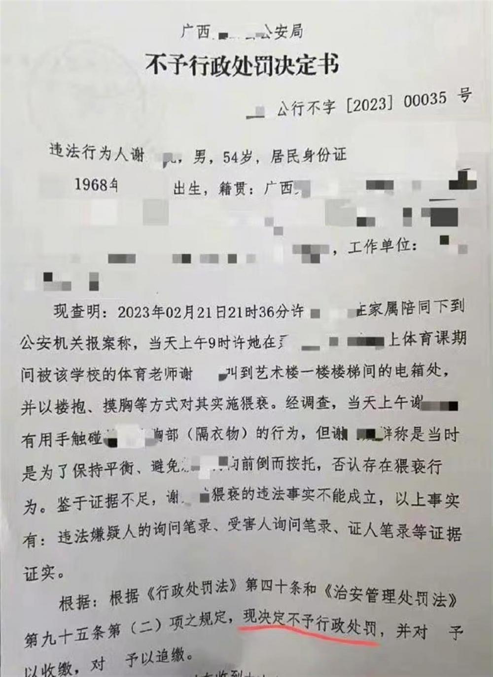 不过,据4月11日警方出具的《不予行政处罚决定书》显示,鉴于证据不足,谢某猥亵的违法事实不能成立,现决定不予行政处罚。