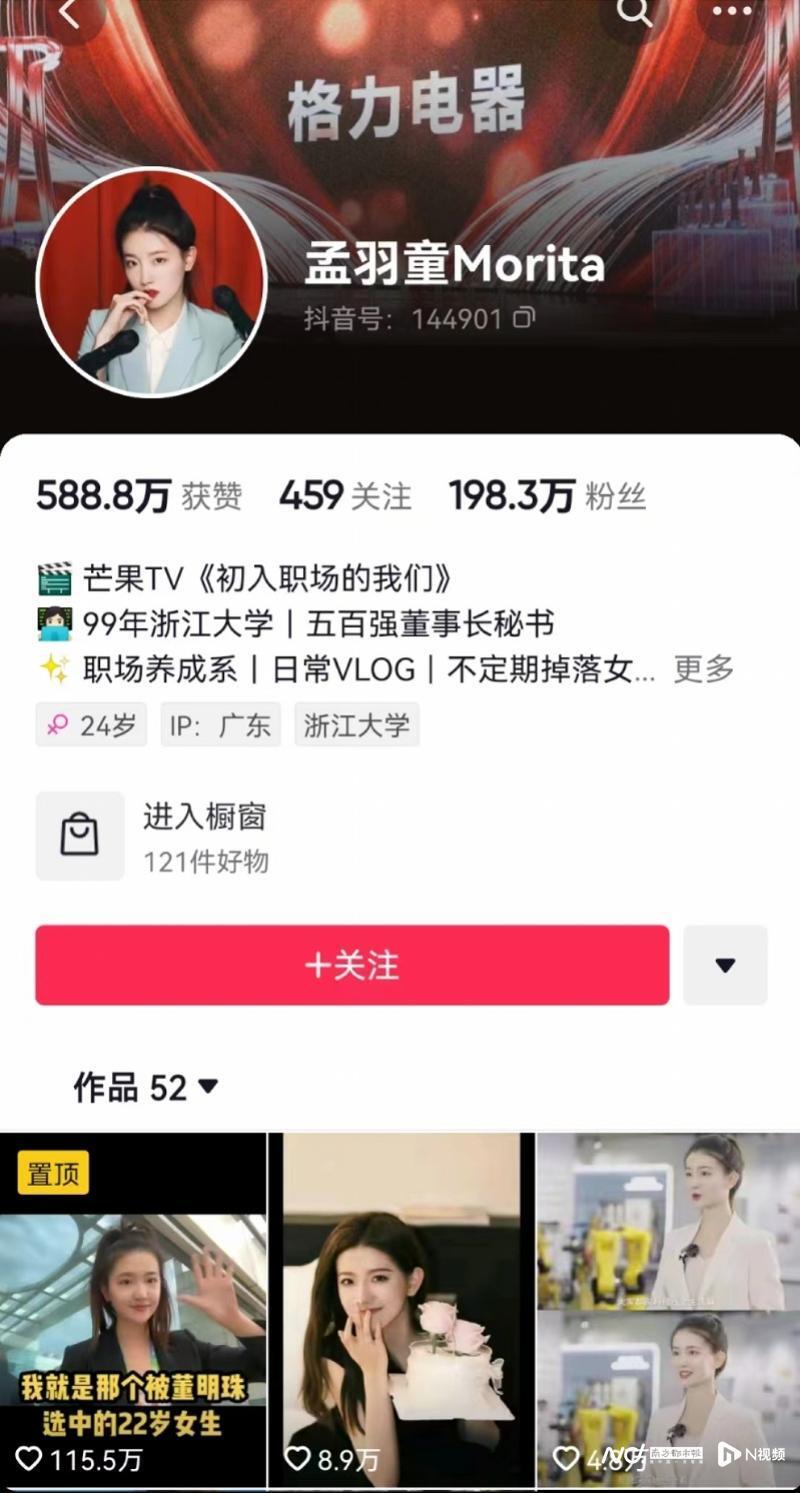 在孟羽童的抖音账号页面,个人说明仍保留着“五百强董事长秘书”,账号拥有粉丝198.3万,获赞次数达到588.8万。任职期间一共发布51条视频,其中约有一半在格力电器工作期间的视频,大部分点赞数量在10万左右,其中置顶的视频为《我就是那个被董明珠选中的22岁女生》点赞数量超过115万。