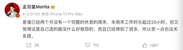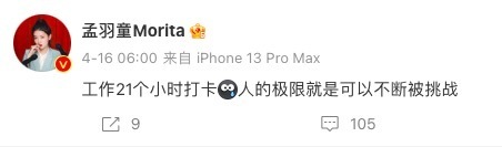 4月16日,孟羽童再次在微博发文:“工作21个小时打卡,人的极限就是可以不断被挑战。”并附上一个黑脸掉汗的表情。