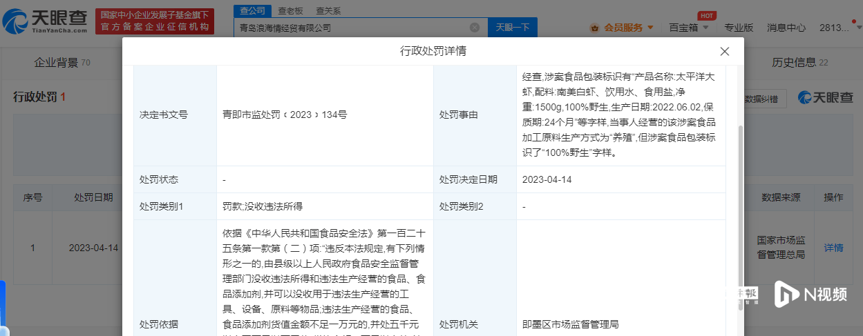 南都记者从天眼查获悉,近日,青岛浪海情经贸有限公司因违反食品安全法,被即墨区市场监督管理局罚款16.68万元、没收违法所得4100元。处罚详情显示,经查,当事人经营涉案食品加工原料生产方式为“养殖”,但食品包装标识有“太平洋大虾 100%野生”等字样。