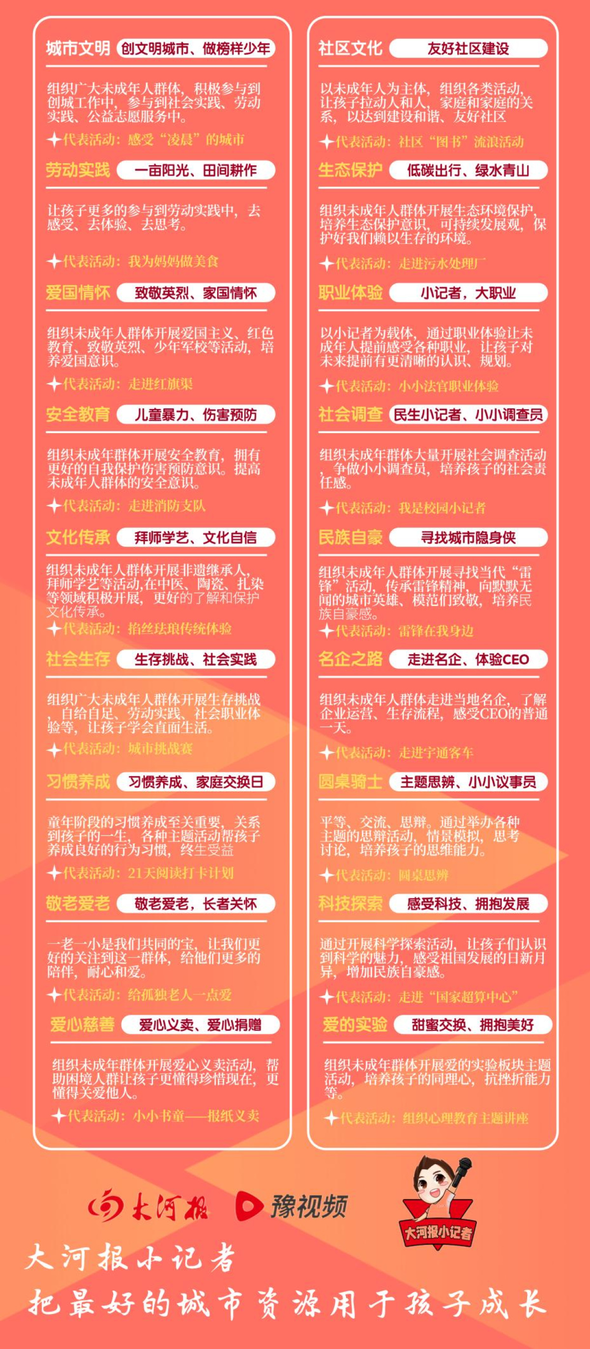 在此我们诚挚欢迎有媒体经验和教育背景的人士及有实力、影响力的学校、团体,并热爱青少年教育事业、有创业激情的团队,成为“大河报小记者城市合伙人”,牵手大河报·豫视频,共谋发展。