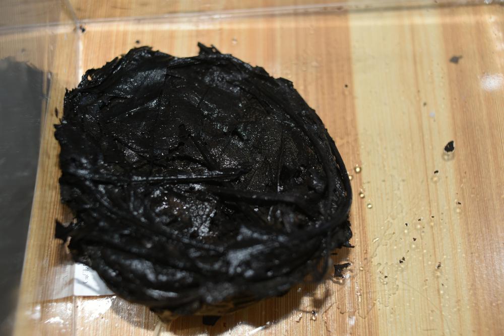 “完整的圆形包裹有40个,还有很多破损散落在椁室底部,这些包裹都由宽大的植物叶子层层包着,由麻绳或者茎秆捆扎,呈现厚圆饼状。”河南省文物考古研究院植物与寄生物考古实验室主任蓝万里说,通过测量,包裹的直径约10至15厘米,厚3至5厘米。