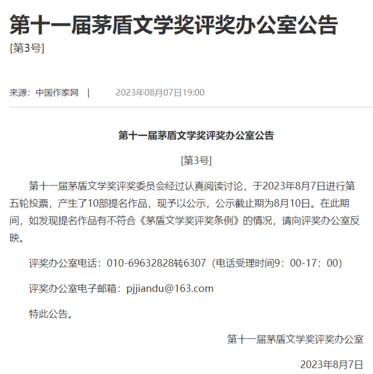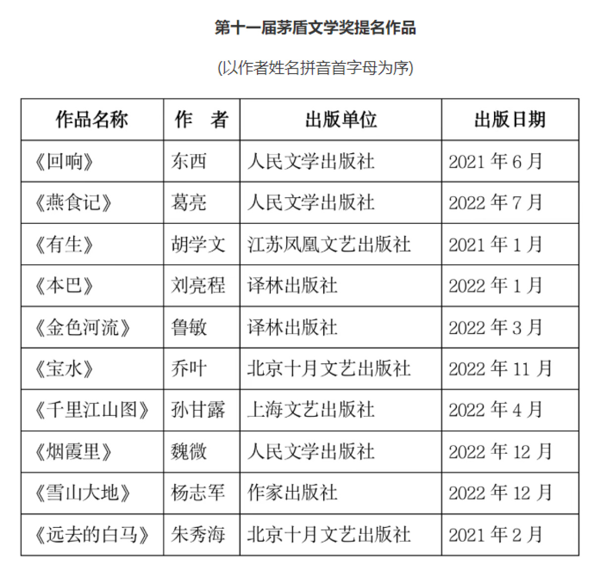 8月7日,经过第5轮投票后,第十一届茅盾文学奖产生10部提名作品并公示,《回响》《燕食记》《有生》《本巴》《金色河流》《宝水》《千里江山图》《烟霞里》《雪山大地》《远去的白马》10部作品榜上有名。其中,两位河南籍作家作品入选,即乔叶的《宝水》,朱秀海的《远去的白马》。