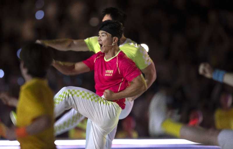“全场跟我一起动起来!”伴随着动感十足的歌曲《龙拳》,健身达人刘畊宏跑向舞台中央。