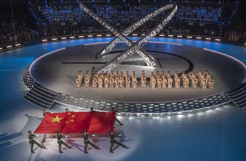 吉祥物人偶和演员们一起载歌载舞,在焰火和欢歌声中将开幕式文艺表演推向高潮。