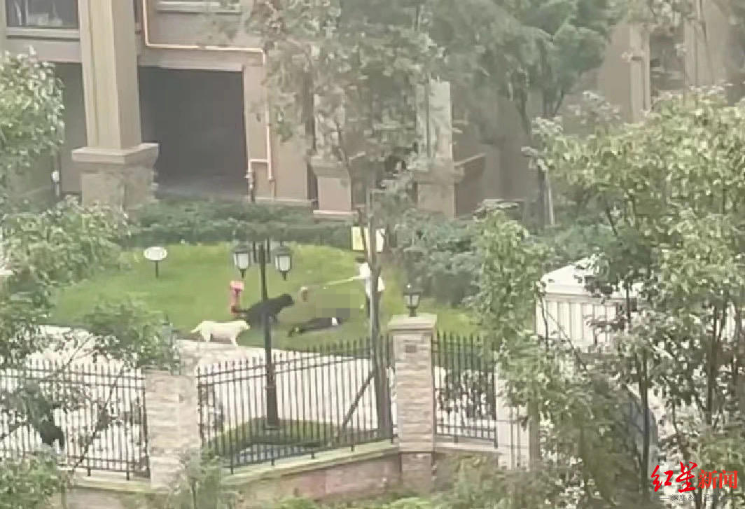 记者获得的一段两分钟网传视频显示,在一栋居民楼下的草地上,一只大型黑色犬撕咬一小孩,时间长达40余秒。而在此前,该犬只已经在楼下走动约1分钟,期间未见犬只主人出现。