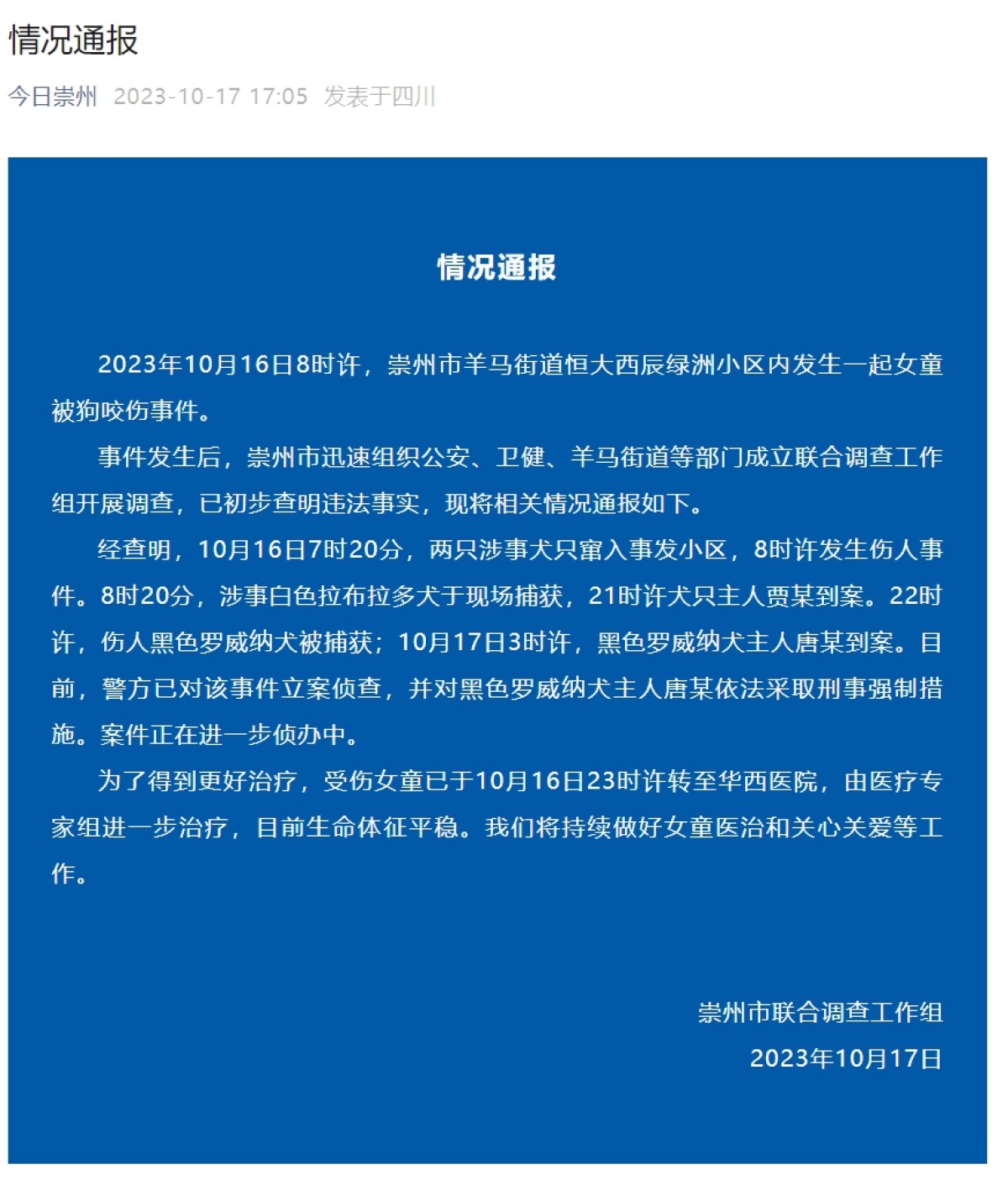 四川崇州联合工作组通报狗咬伤女童情况:罗威纳犬主人被采取刑事强制措施