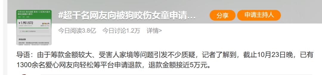 10月16日,成都市崇州市羊马街道一小区内,一名两岁女童被罗威纳犬撕咬致右肾挫裂伤。家属在轻松筹平台上发起筹款后,短时间内获得网友捐助200余万元。由于筹款金额较大,受害人家庭经济能力等问题,该事件也陷入争议。