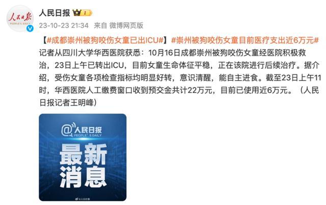 此前媒体报道,10月23日,据人民日报报道,四川崇州被狗咬伤女童已转出ICU。据悉,其各项检查指标均明显好转,意识清醒,能自主进食。