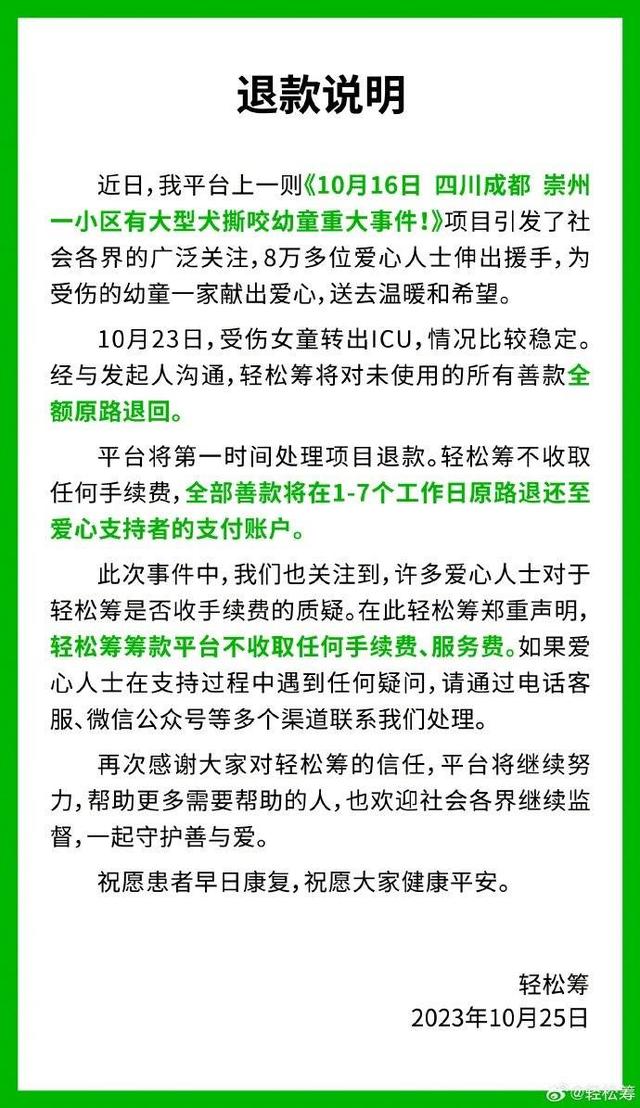 据新京报10月26日报道,平台显示,目前被狗咬女童的200万捐款已基本退完,仅剩2人的30元善款长时间未能退回。10月25日,轻松筹平台发布退款声明,通报大型犬撕咬幼童筹款情况,称未使用的所有善款将全额原路退回。10月23日,被咬的女童从ICU病房转入普通病房。女童家属决定将在轻松筹平台筹到的200万善款(发文时余额1919367元)全额原路退给捐赠人。家属表示,感谢社会公众在危难之际伸出爱心之手,将铭记恩情。
