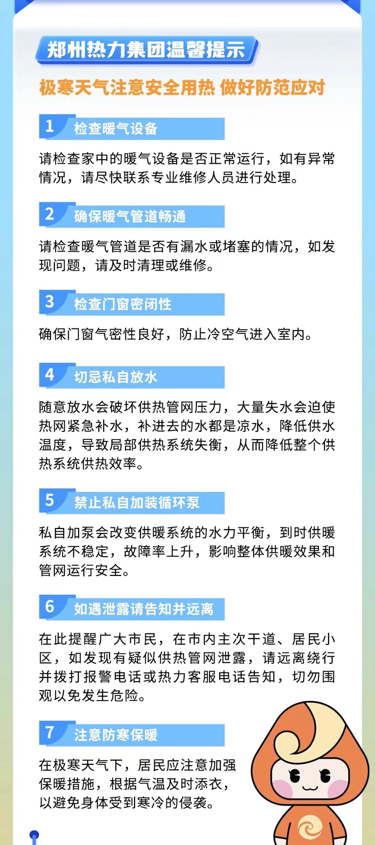 郑州热力集团结合智慧供热系统全程监控用户供热效果,做好区域内流量平衡分配。组织9个供热分公司对市区9座锅炉房、7座隔压站及3400公里供热一次管网开展新一轮巡检排查,尤其是对重点老旧供热管网加强巡视,提前消除隐患。做好供热设备设施的防冻工作,加强与电力、供水、燃气维护单位的联系,确保寒潮期间供热设备设施安全平稳。