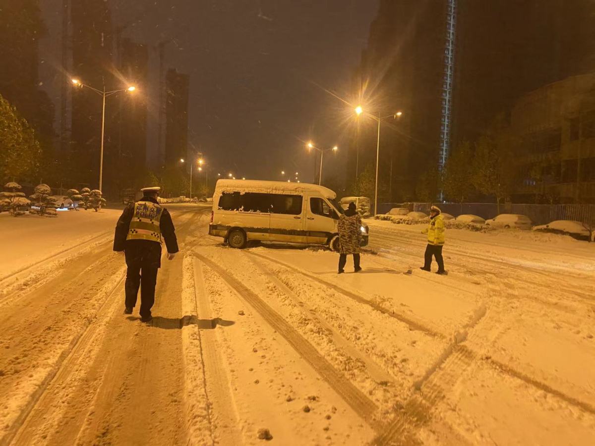 路面积雪结冰,郑州交警凌晨帮助80多位雪地受困车主“脱险”