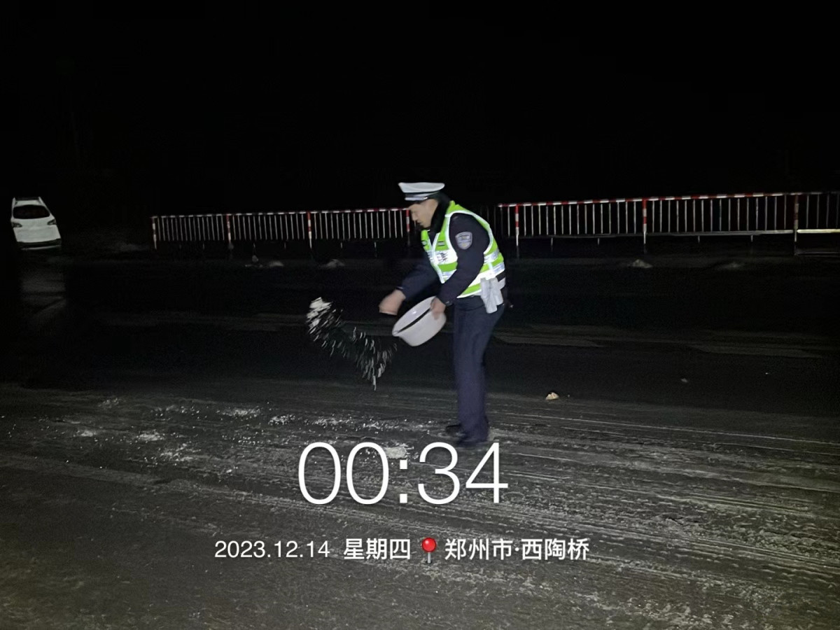 12月13日晚上,在桥梁、涵洞、陡坡等易结冰点段,中牟交警及时安排专职警力,严看死守,一旦发现结冰,立即采取撒盐融雪或封控措施,确保道路交通安全。在310国道、312省道、郑开大道、物流通道等重点道路,雪夜里警车闪着警灯,在来回巡逻,民警还不停地通过警车的高音喇叭喊话,提醒司机减速慢行,保持车距,注意安全。