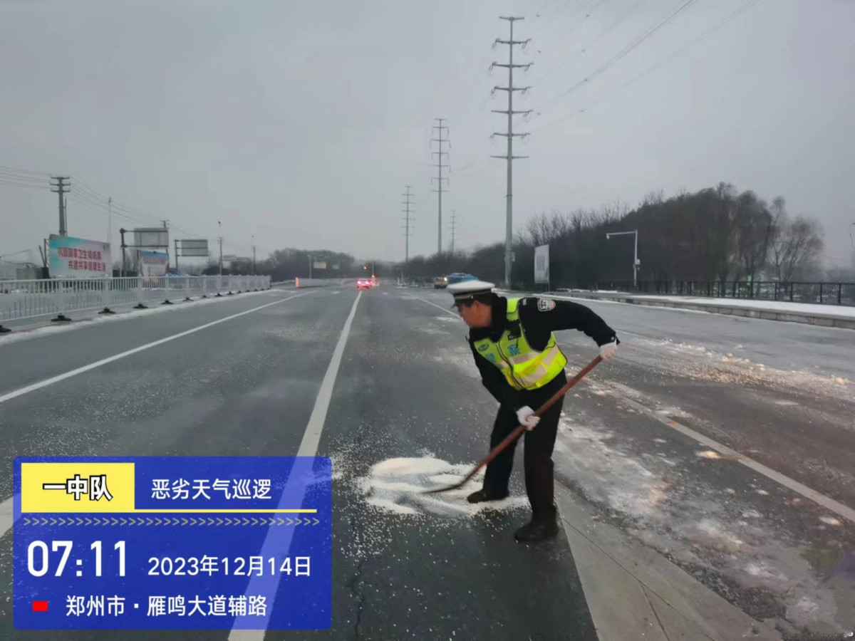 一场大雪尚未完全融化,又一场冻雨悄然来袭。气温低下,路面结冰,湿滑难行,极易发生道路交通安全事故。为有效预防和减少道路交通事故的发生,全面保障群众出行安全,针对新一轮冰冻雨雪天气,中牟交警以雪为令,闻雪而动,全警动员,全力以赴保障群众出行安全。