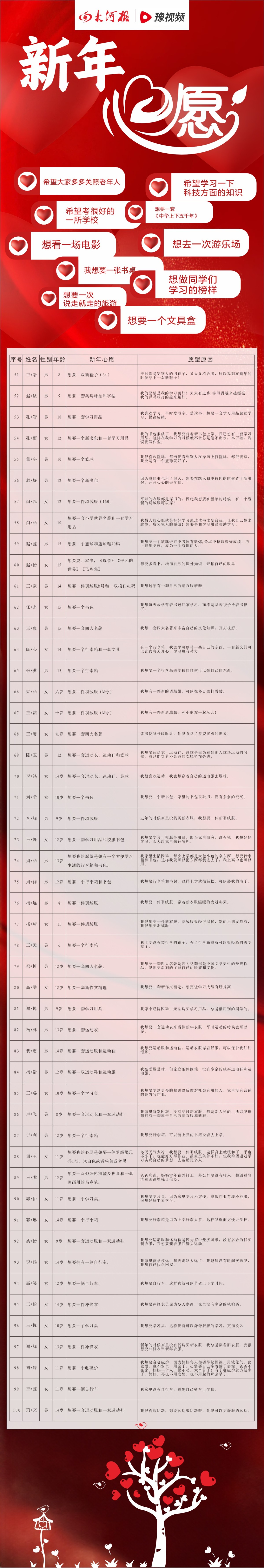 1.大河报·豫视频客户端“新年心愿,童梦齐圆”专题,每天都会编辑刊登部分孩子的新年心愿。爱心市民或企业可拨打本报圆梦热线0379--62626110联络记者认领心愿。
