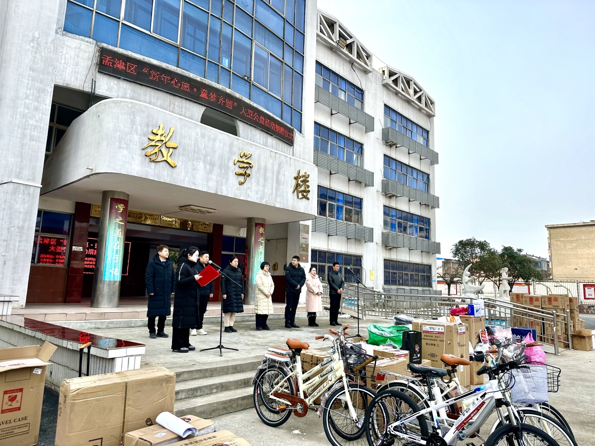一辆辆崭新的自行车、一套套名著读物、崭新的羽绒服棉鞋……21日上午,当装满爱心物资的车辆抵达,源源不断的物资汇集,爱心企业和志愿者们将标有编号的物资,整齐地摆放在校园内,城关镇第一初级中学交接仪式现场很快被爱心填满。