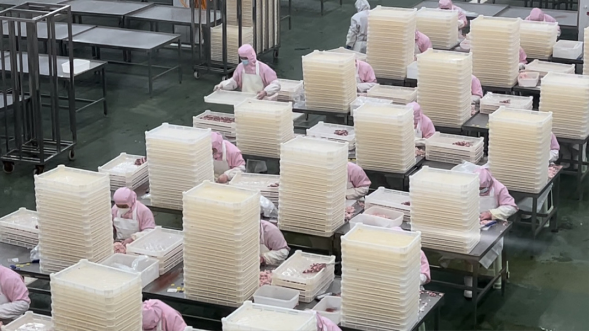 冷切车间里,近百台分切包装设备将牛羊肉分切成丝、丁、片、块、粒、条等系列产品,设计产能日加工成品30吨。在调理车间,6座低温高湿解冻库可同时解冻160吨牛羊肉产品,38条智能化生产线,设计产能日加工成品60吨;在生鲜车间,这里展示了整羊分割的全过程,从活羊进入屠宰线到成品整羊分割全程约16分钟;在最后的熟食车间,这里有先进的自动化加热循环水解冻机、自动化褪毛机和自动化蒸煮机等流水线生产设备,生产线全长168米,日熟食加工能力30吨。经过屠宰、剔骨、分割、冷切、调理等一道道工序,冷切系列、烹饪系列、烧烤系列、火锅系列、熟食系列等品类繁多的产品,通过雨轩搭建的电商渠道,走出厂门,销往省内外各大餐饮门店……