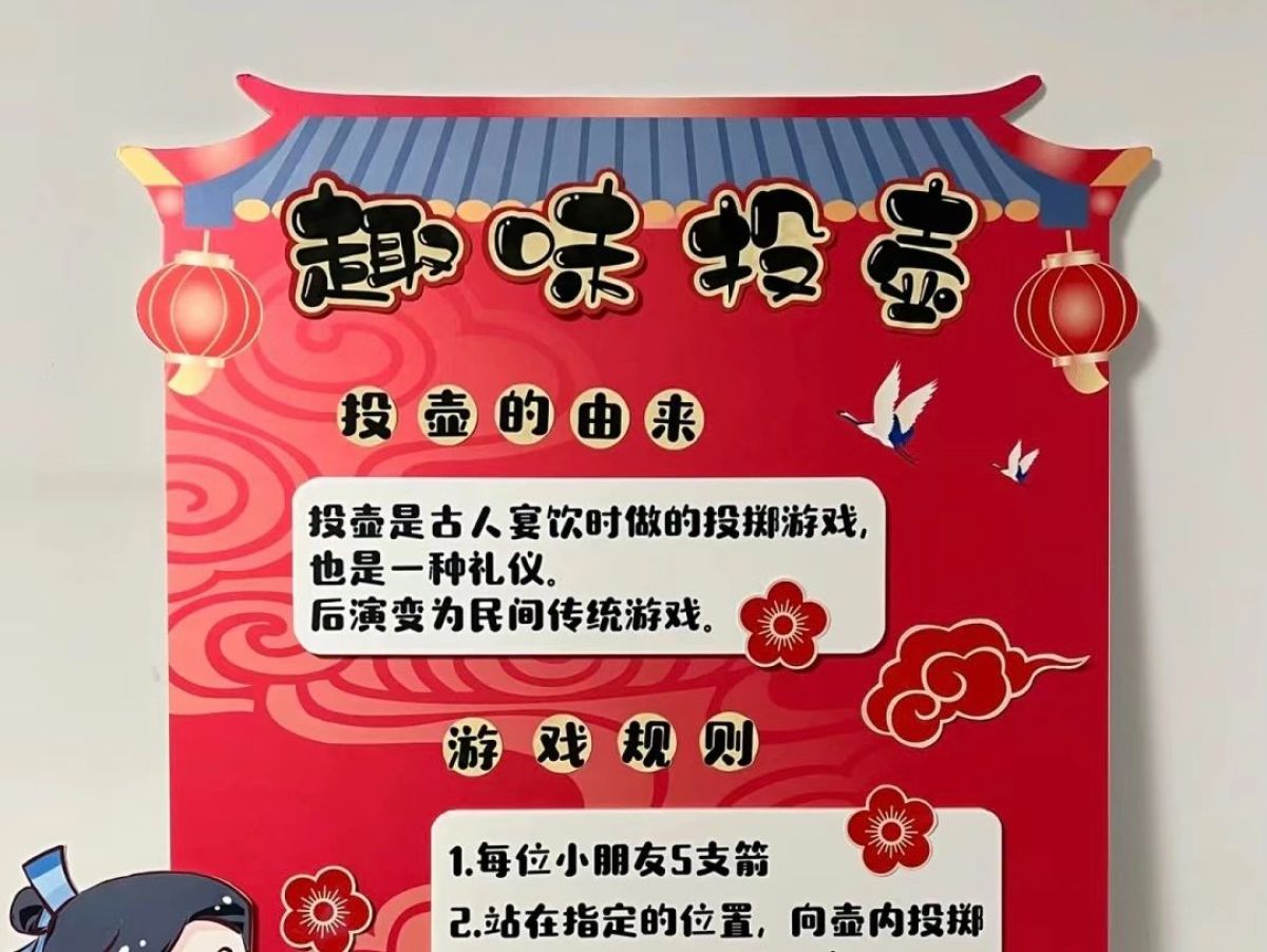 活动二:趣味投壶一边体验这项传统游戏的乐趣,一边通过游戏了解投壶的文化内涵(面向全体游客)。初一至初八,每天上午10:00-12:00,每天下午14:30-16:30。