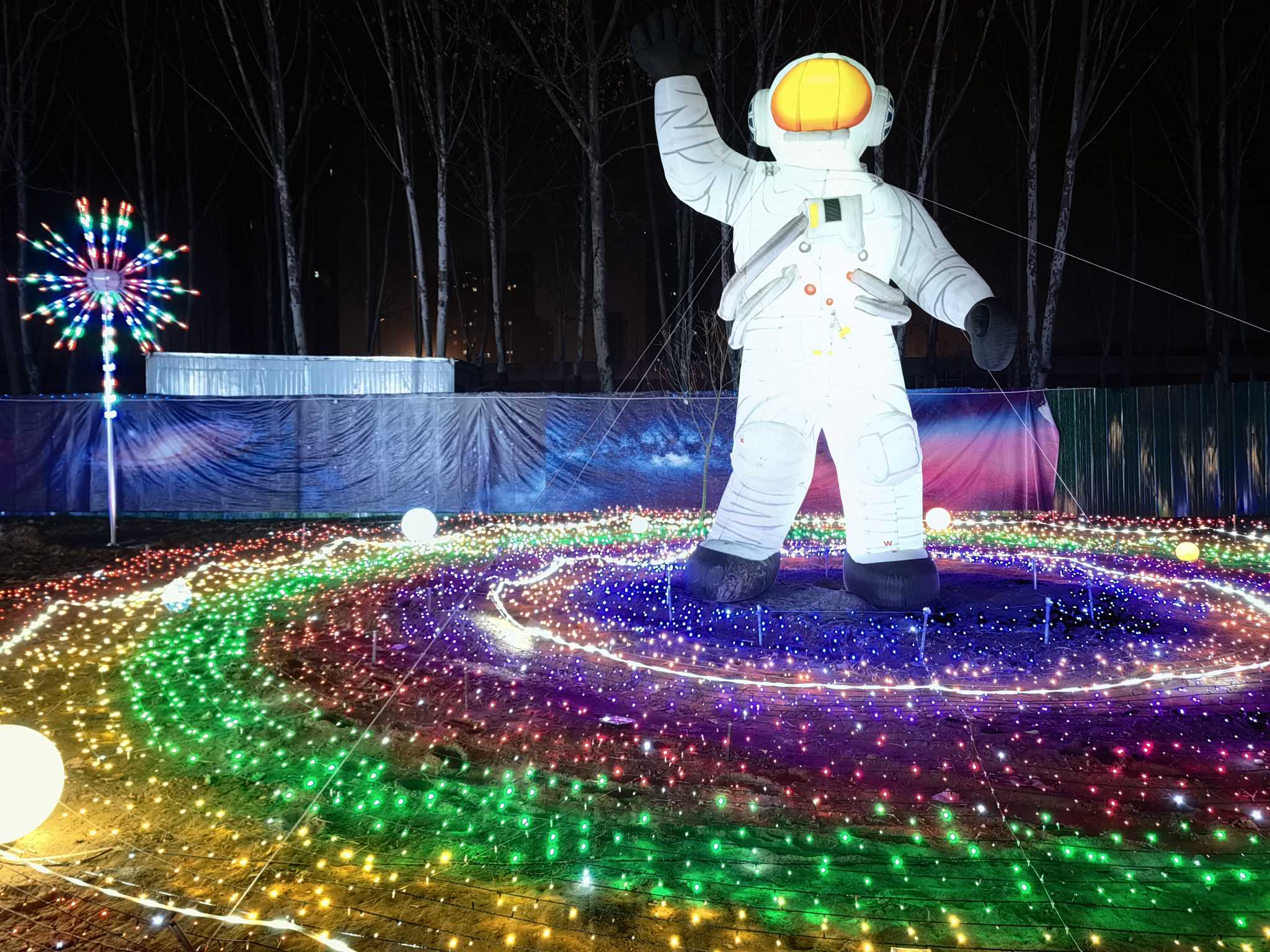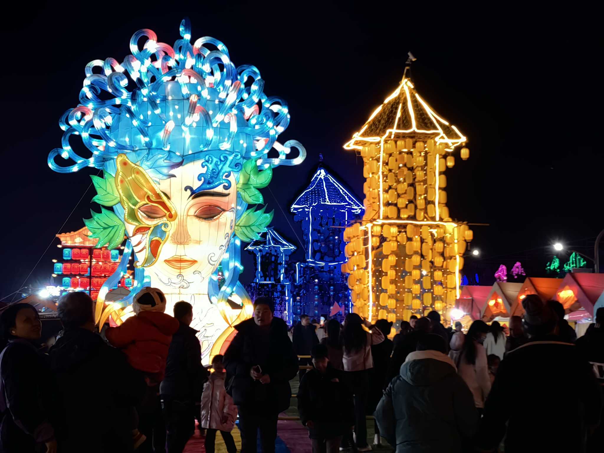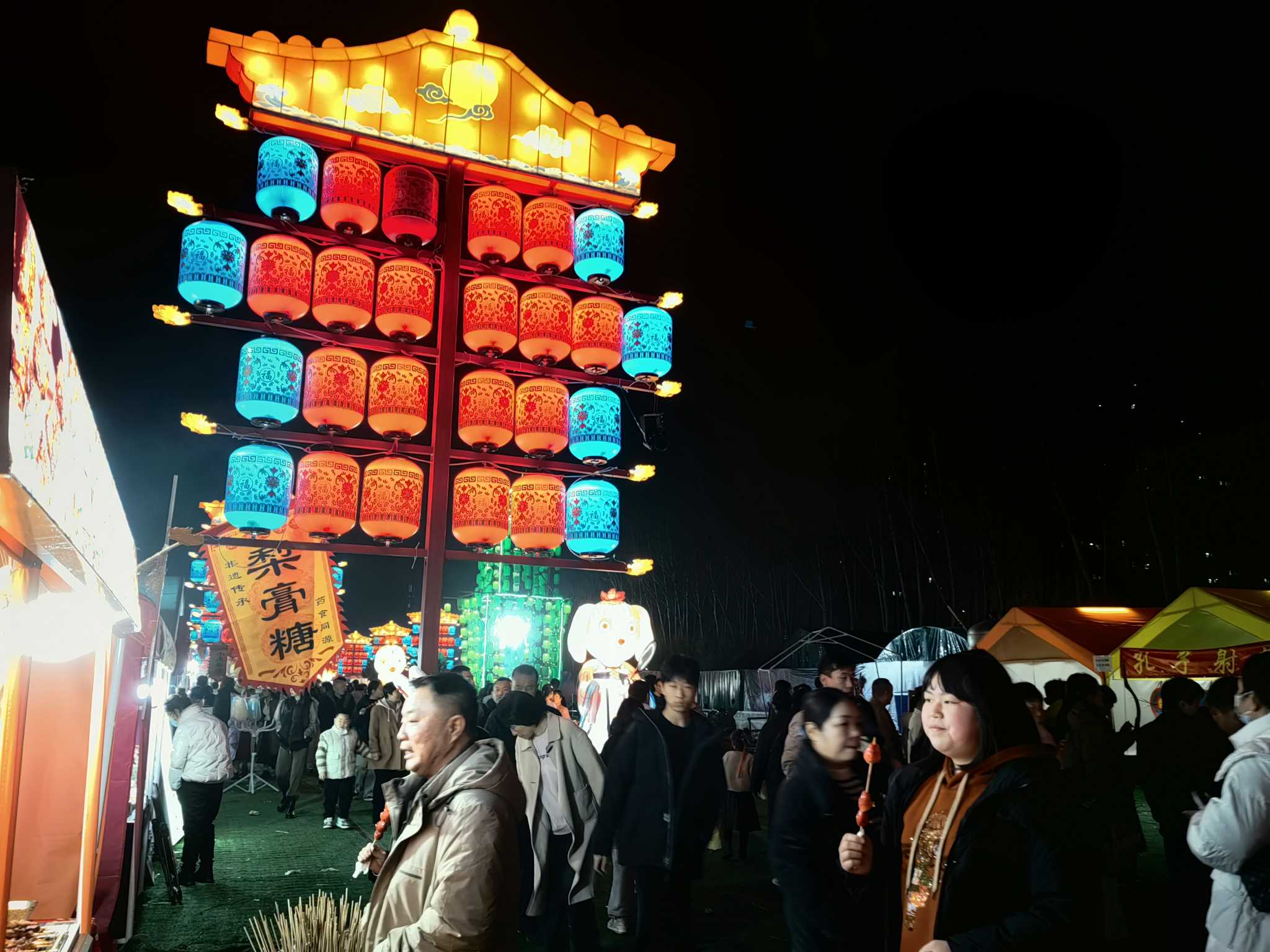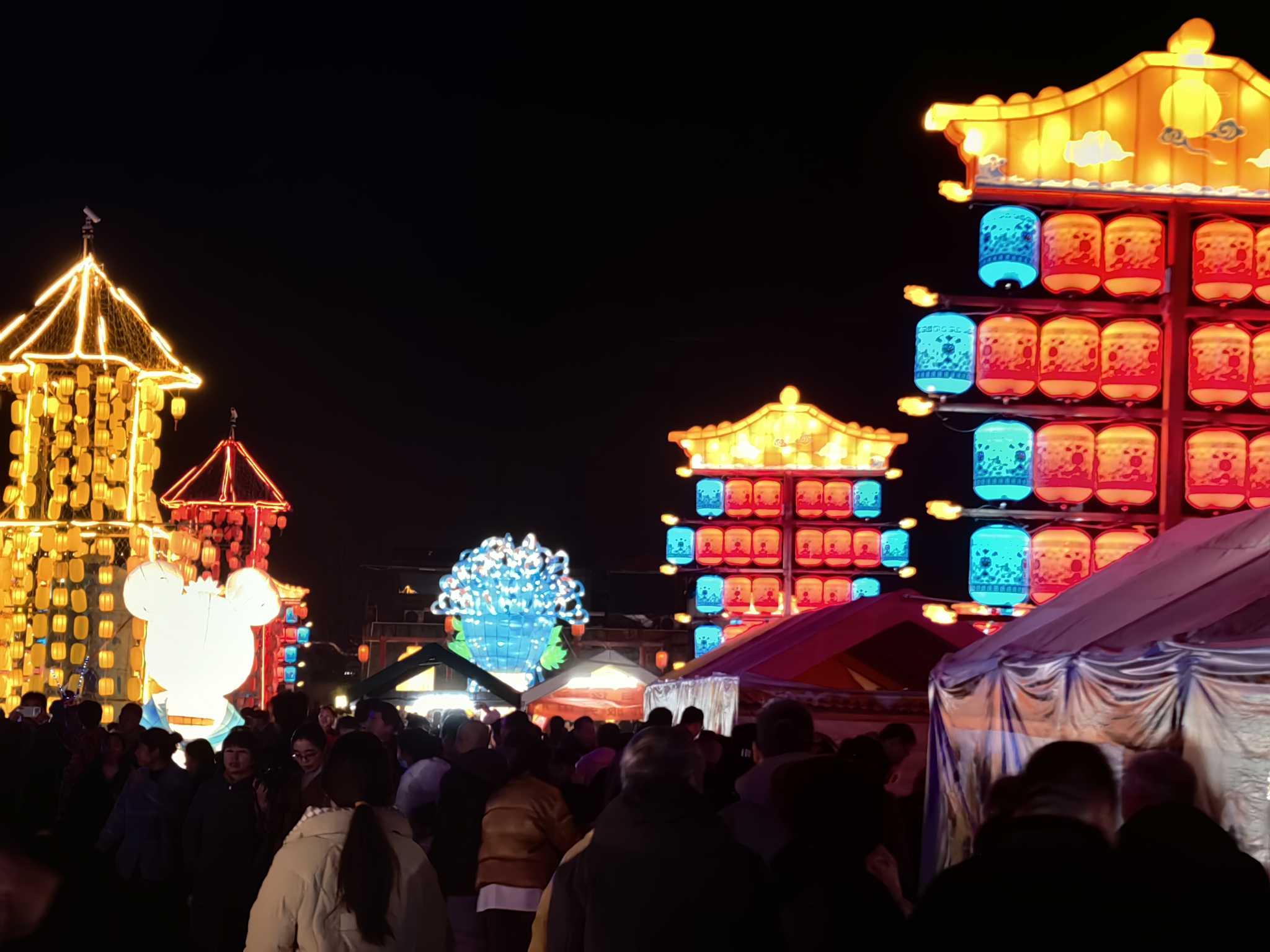庙会现场,人山人海,热闹非凡。各种造型的彩灯多姿多彩,璀璨夺目,吸引众人拍照打卡。这里,除了有可观赏的彩灯外,还有五花八门的娱乐休闲项目,如套圈、射击、迷宫等。