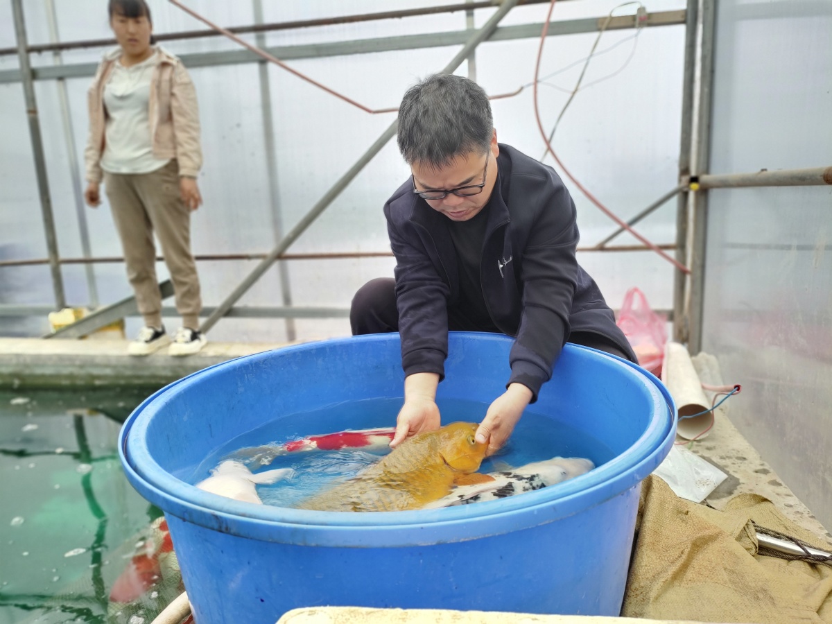 每年清明节前后,是锦鲤人工繁殖的季节,然而由于今年寒冷期长,繁殖时间被延后了。徐文彦和团队在鱼池里,查看待产的母鱼,发现有外伤的精心消毒、治疗。“天气冷,种鱼的排泄物又长又黏,需要在饵料上、水质上针对性调整,养观赏鱼是一件非常需要耐心和专业能力的工作。”徐文彦说。