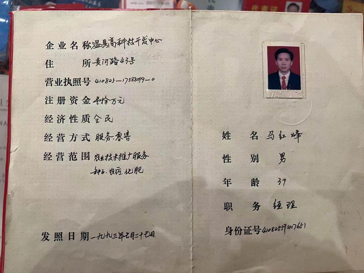 采访中,马红峰给记者展示了一张1993年的营业执照,企业名称一栏写着“温县高科技开发中心”,经营范围主要是农业技术推广服务,另一页贴着马红峰37岁时的照片。