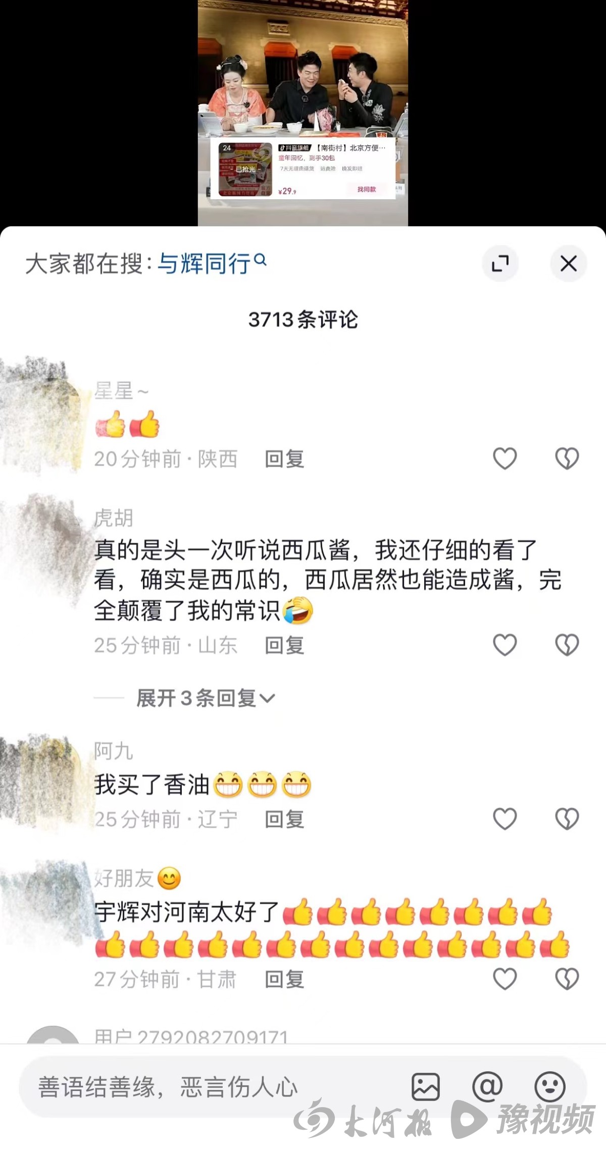 在宇辉河南行的第一场直播中,很多来自河南的极具地方特色的农产品被全国人民熟知,除上述产品外,芝麻叶、芝麻盐、洋槐花等产品也引发不少网友的讨论,“第一次听说这种白色的话还能吃,河南的洋槐在今天之后都要被薅秃了吧。”来自福建的网友在直播间如此评论道。