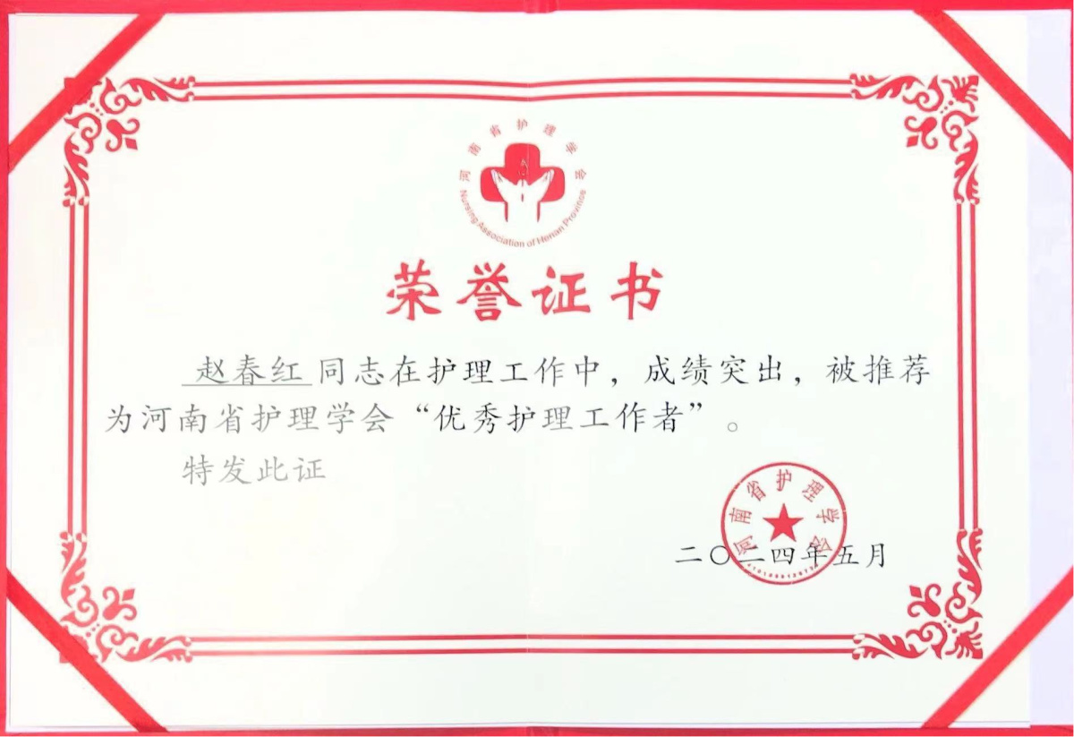 从一名普通的护士,到负责一个科室的护理工作,再到负责一个医院的护理工作,28年来,赵春红脚踏实地、高标准履行岗位职责,带领团队多次参加护理创新活动并多次荣获省级、市级荣誉。她个人也先后荣获漯河市优秀护士、漯河市第二届最美护士、漯河市护理管理先进工作者、郾城区三八红旗标兵等称号,发表学术论文20余篇,参与编写护理专业教材1部,参与省、市科研项目10项,获批国家发明专利1项、实用新型专利4项,主持校级科研校目5项。