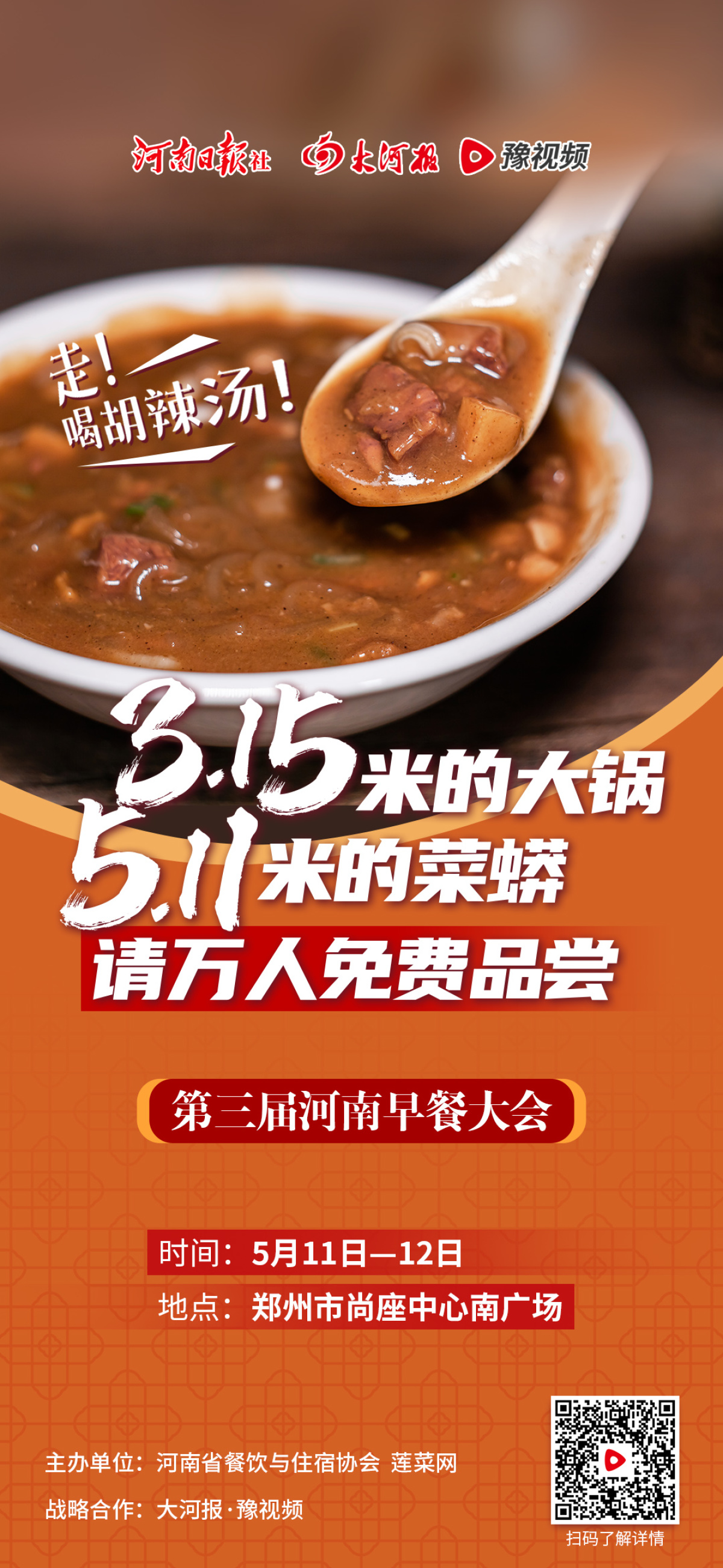 在5月11日开幕的第三届河南早餐大会上,大河报·豫视频记者直击现场,发出第一篇报道《“中原第一锅”现熬胡辣汤、5米大菜蟒!免费品尝,速来!》后,引发无数在外地的河南人为家乡美食“折腰”,并发出了这句感慨。
