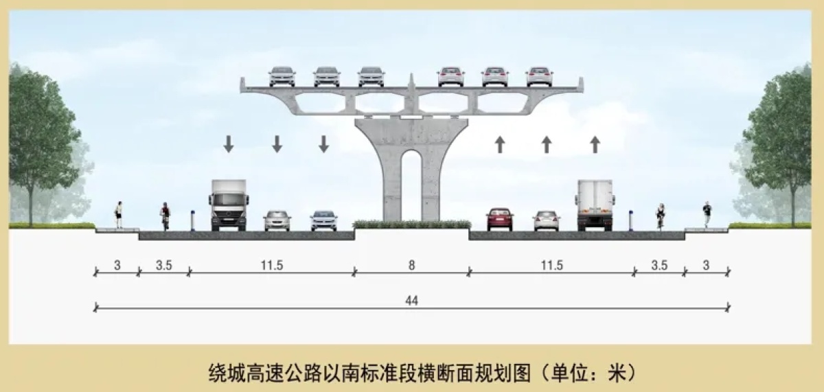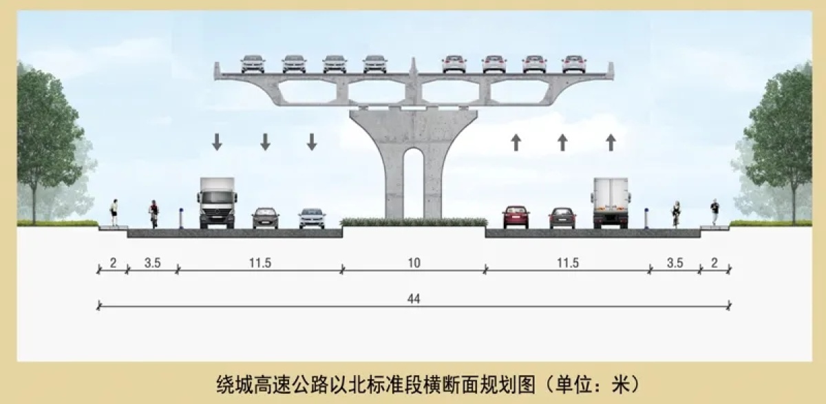 本项目规划方案总体采用高架快速路形式,重要节点设置立交。在满足交通功能的前提下,尽量减少占地规模,全线标准段规划实施宽度为44米。