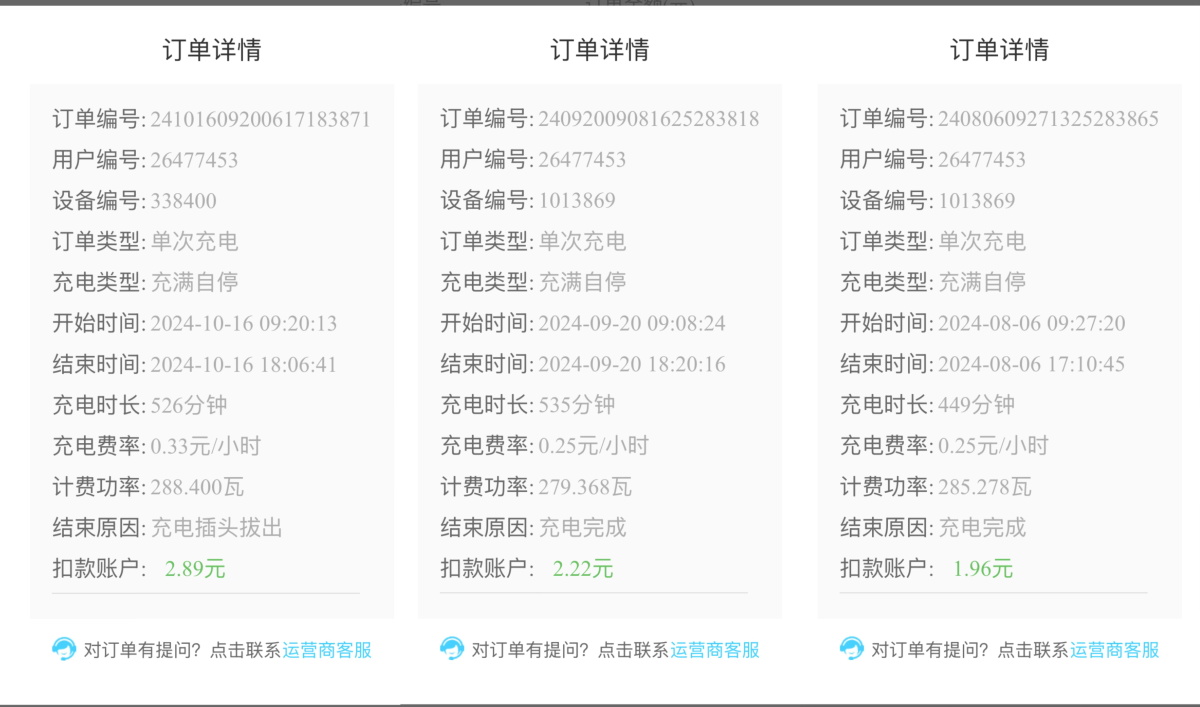 记者发现,张先生出示的两张充电记录截图显示,其中一次充电时长为526分钟,充电费率为0.33元/小时,计费功率为288.400瓦,充电费用为2.89元;另一个的充电时长为535分钟,充电费率为0.25元/小时,计费功率为279.368瓦,充电费用为2.22元。