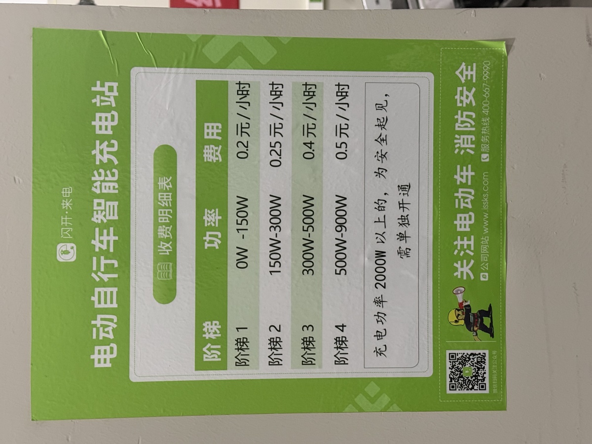 随后大河报·豫视频记者来到位于惠济区北三环与铁东路的理想星光小区,进入该小区的负一层,在很明显的位置张贴着一张电动自行车智能充电站收费明细表,电动自行车的功率不同,收费标准也不一样。150瓦以下为0.2元/小时;150瓦到300瓦之间为0.25元/小时;300瓦到500瓦之间为0.4元/小时;500瓦到900瓦之间为0.5元/小时。