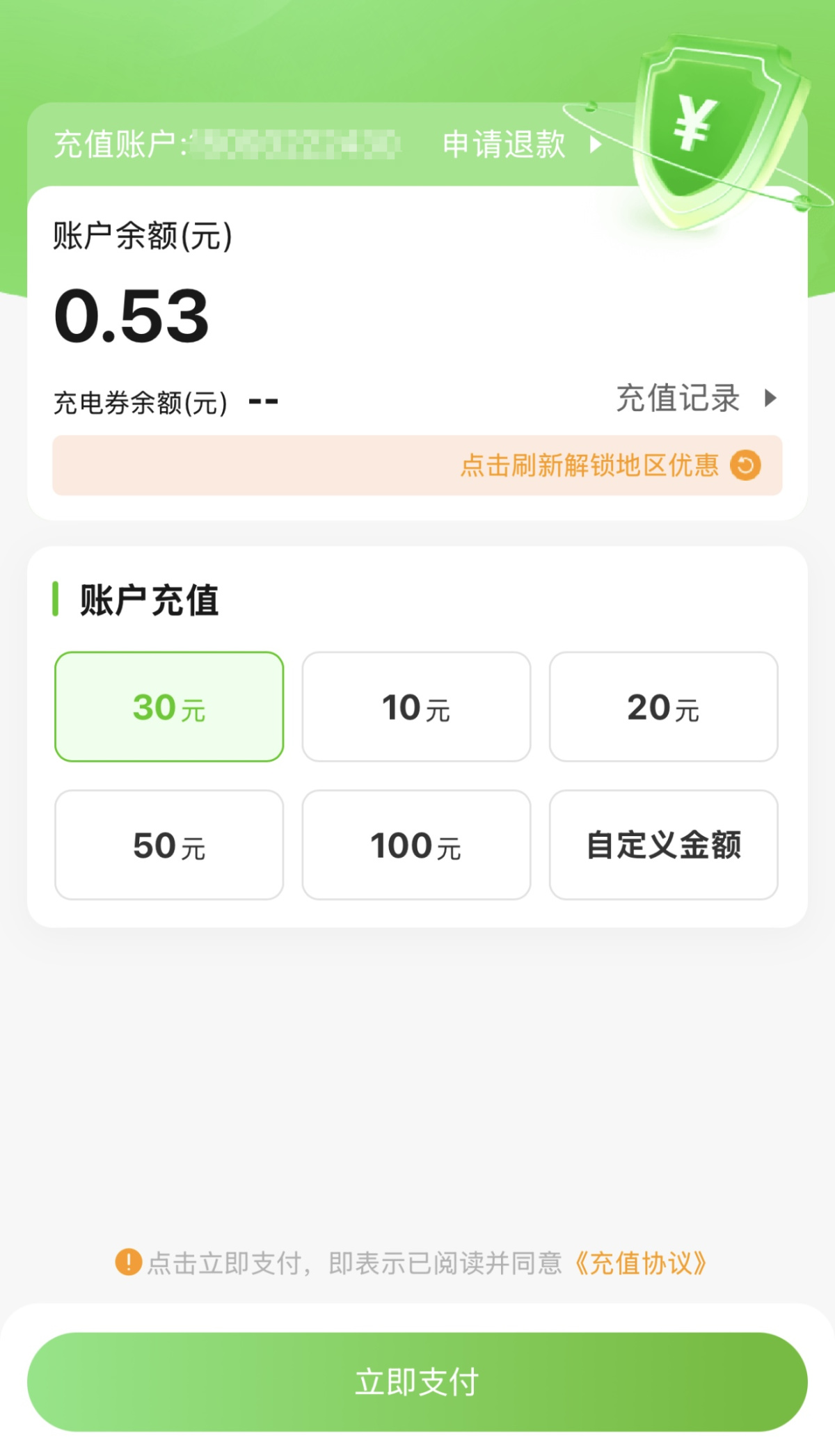 随后记者来到位于惠济区北三环与铁东路的理想星光小区,扫码进入充电缴费页面。页面显示,该充电桩名为“闪开来电”,同样显示账户余额低于2元,需先进行充值。记者打开充值页面,发现其可以自定义金额进行充值,记者随后点击自定义金额进行充值,页面提示充值金额不能少于10元,不过在余额页面,可以申请退回剩余金额。