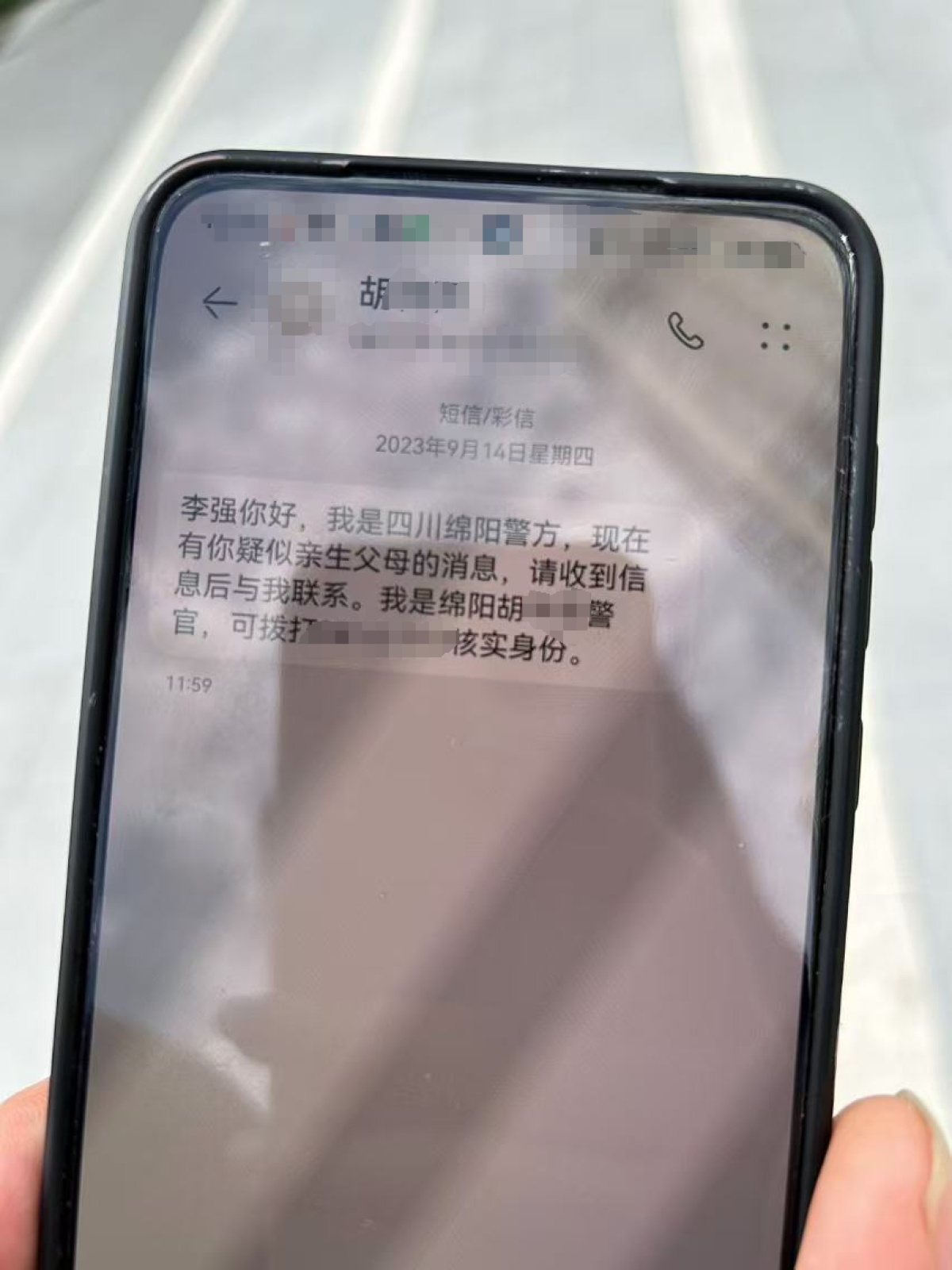 2023年9月15日早上,在北京正准备上线跑外卖的他看到了四川胡姓警官发给他的短信——“现在有你疑似亲生父母的消息,请收到信息后与我联系”。