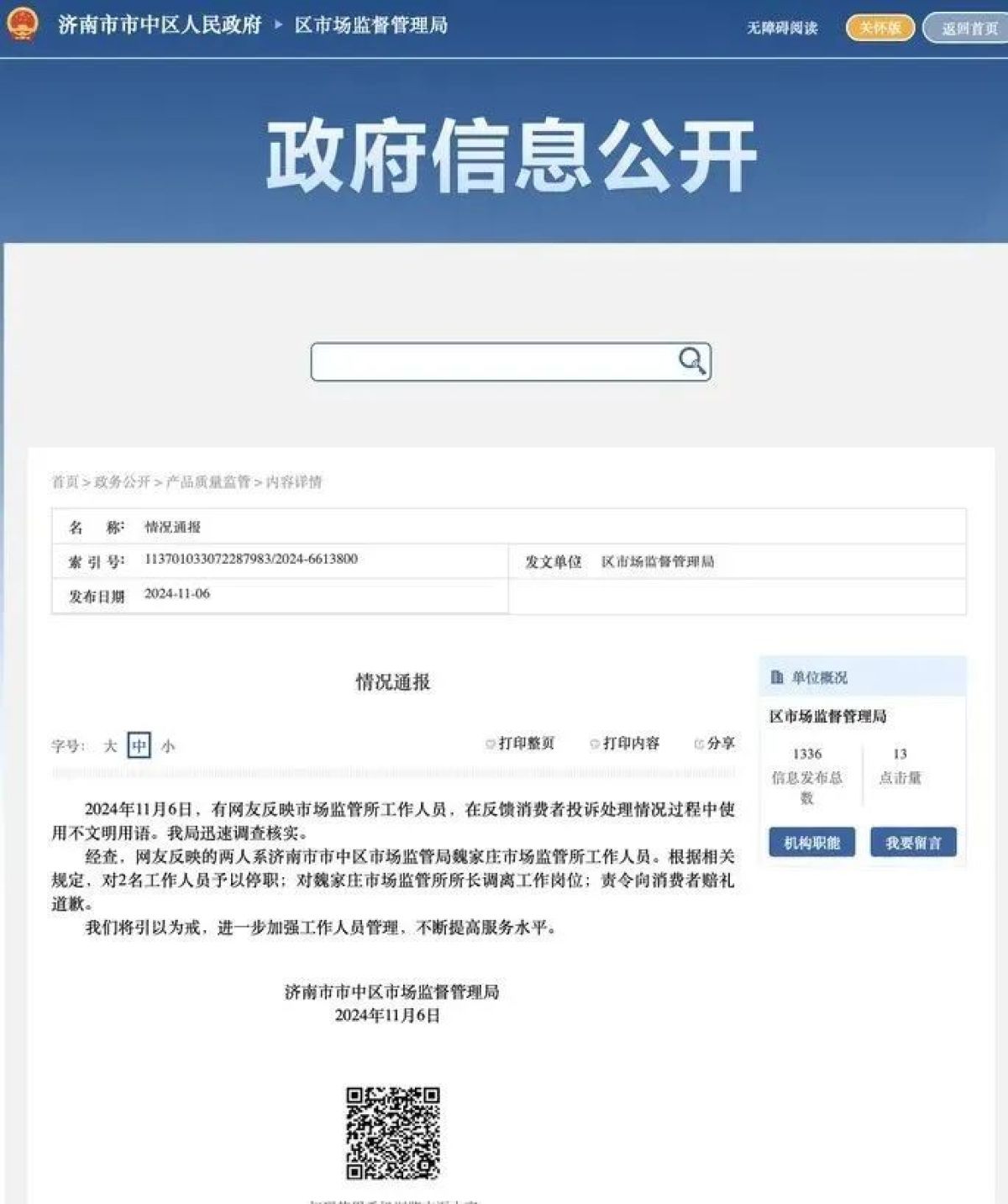 通报称,经查,网友反映的2人系济南市市中区市场监管局魏家庄市场监管所工作人员。根据相关规定,对2名工作人员予以停职;对魏家庄市场监管所所长调离工作岗位;责令向消费者赔礼道歉。