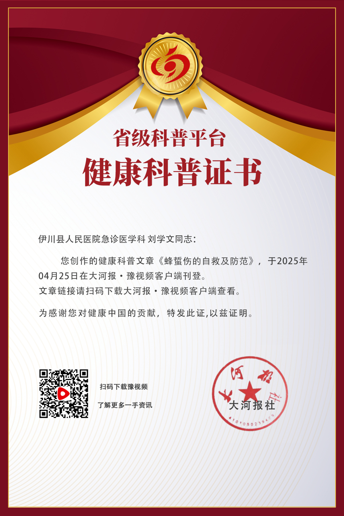 蜂蜇伤虽不可完全避免,但通过了解相关知识、采取合理的预防措施和自救措施,我们可以大大降低其带来的风险。让我们从自身做起,提升安全意识,共同守护自己和家人的生命安全。在未来的日子里,愿我们都能在户外活动中享受大自然的美好,远离蜂蜇伤的困扰。(伊川县人民医院 急诊医学科 刘学文)