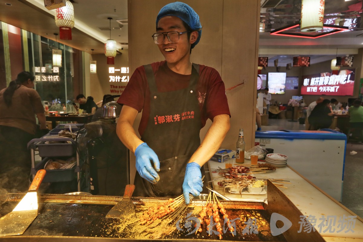 19岁的尹新岩站在烧烤摊前,一手握着鱿鱼串,一手拿着铁铲按压煎烤,“滋滋”冒油的铁板上散发出诱人的香味。“这是今天第26号客人点的餐,夏季晚上都喜欢吃烧烤。”5月11日晚8时许,正在周口“好吃城”忙活的尹新岩告诉大河报·豫视频记者。