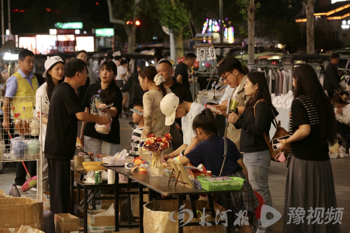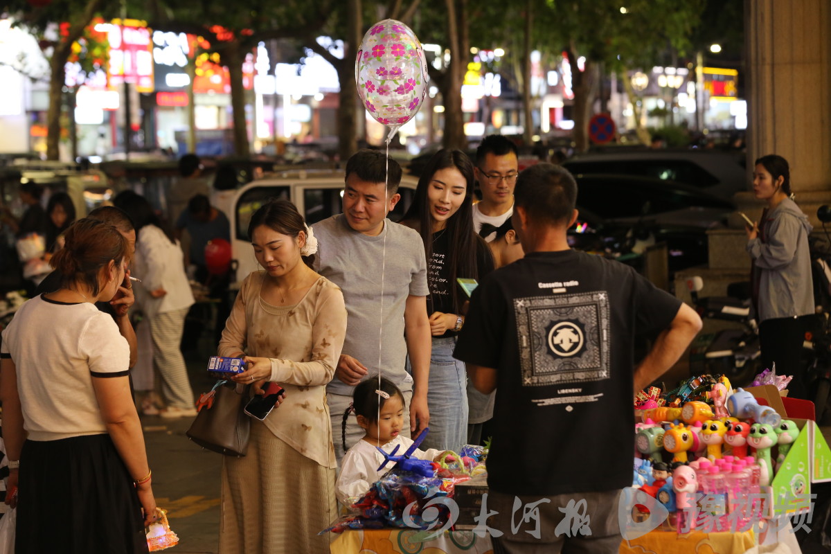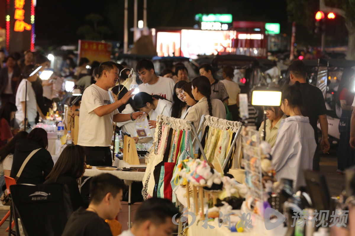 5月11日晚7时30分许,华灯初上,周口“好吃城”的霓虹灯开始闪烁起来,带着各式商标和宣传文案的灯牌,衬托出城市夜晚的繁华。“好吃城”门前,是专门用来摆地摊的特色商业区,琳琅满目的小商品让前去逛夜市的市民们应接不暇。“这个钥匙扣不错,多少钱?”“6块!”“少点吧,5块钱……”在热闹的讨价还价声中,温馨的烟火气扑面而来。