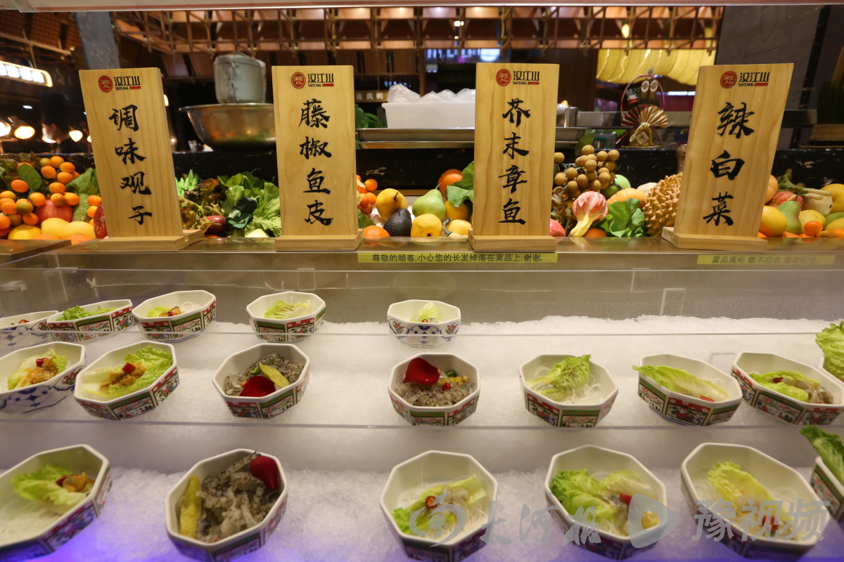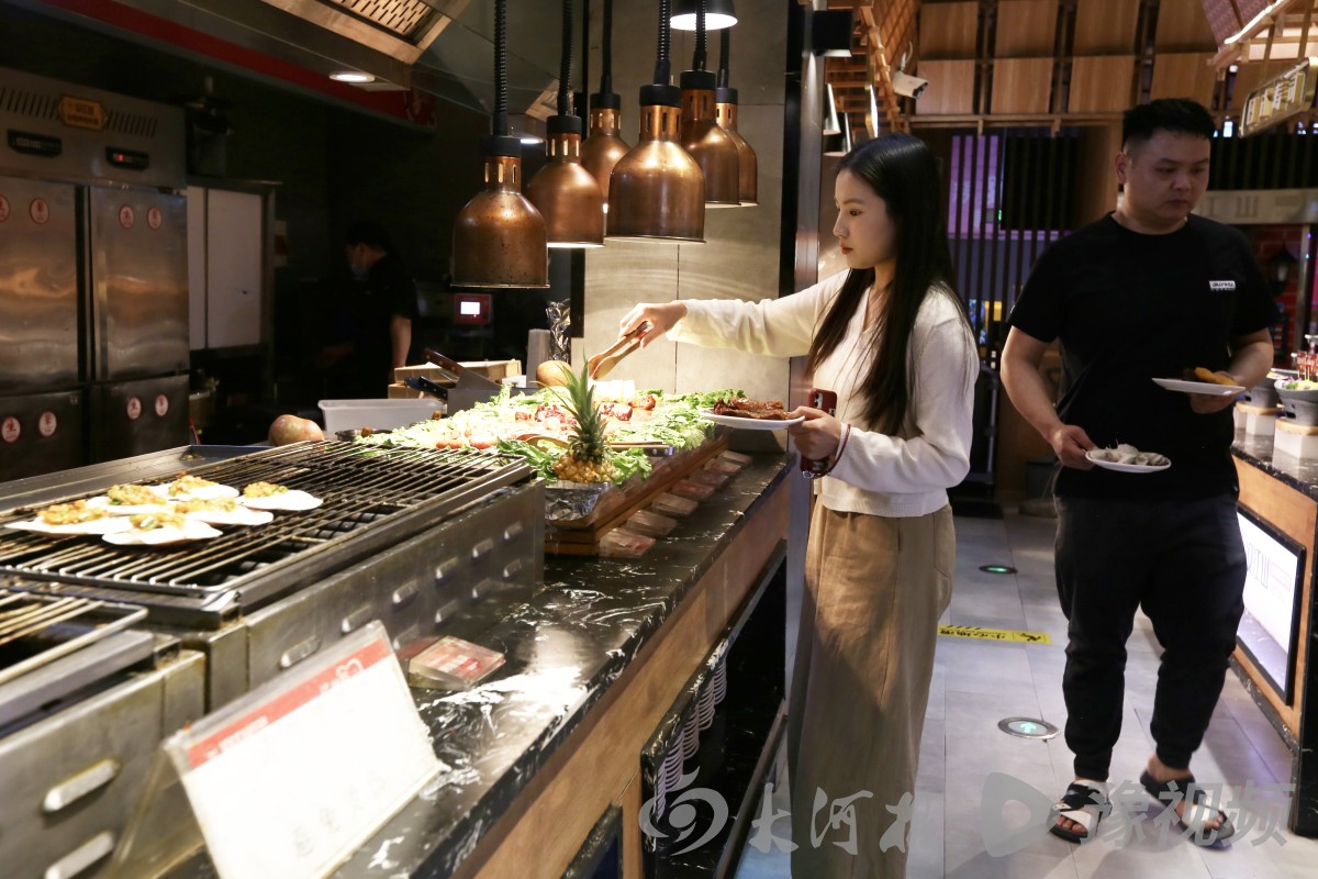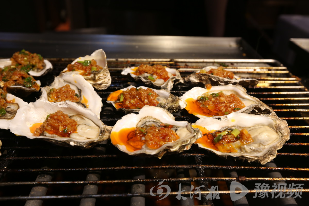 在“好吃城”楼上的海鲜自助餐厅,各式各样的鱼、虾等海产品通过飞机运输到中原腹地的夜市餐桌,丰富着人们的味蕾体验。这里的海鲜可以用铁板烤着吃,也可以下火锅煮着吃,麻、辣、咸、鲜,口味可以自选,成为夜经济的火爆打卡点。