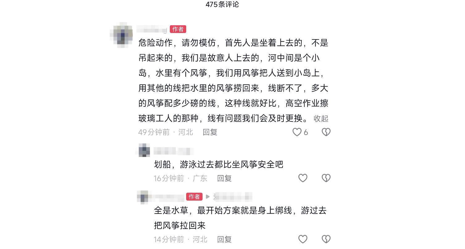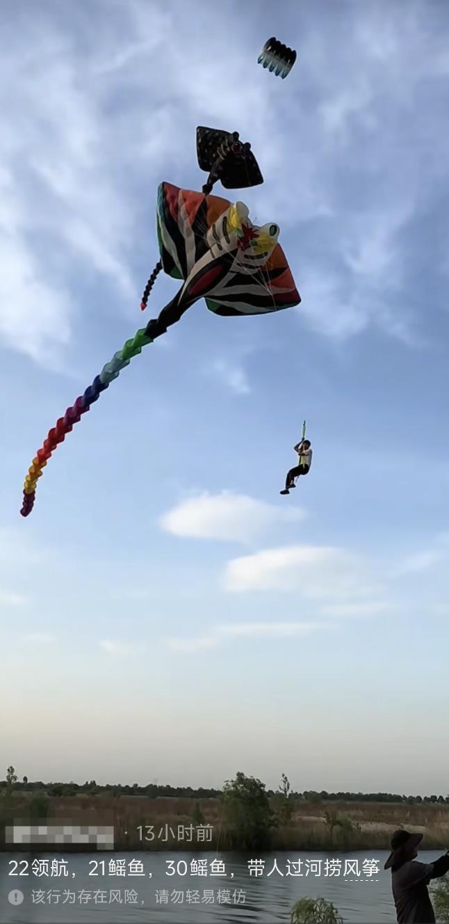 极目新闻记者注意到,疑似放飞该巨型风筝的团队成员也在个人短视频账号上讲述了事件过程,他介绍称:“危险动作,请勿模仿。人是坐着上去的,不是吊起来的,我们是故意让人上去的,河中间是个小岛,水里有个风筝,我们用风筝把人送到小岛上,目的是把水里的风筝捞回来。最后,人和风筝安全落地。”